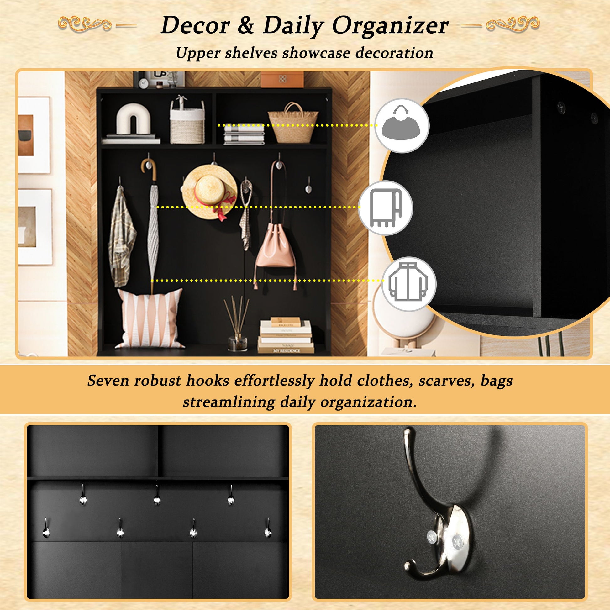 - Spacious Shelves and Hooks: The product features two upper-level shelves perfect for displaying exquisite decorations, alongside seven sturdy hooks designed to hold clothes, scarves, and bags, ensuring optimal organization.
