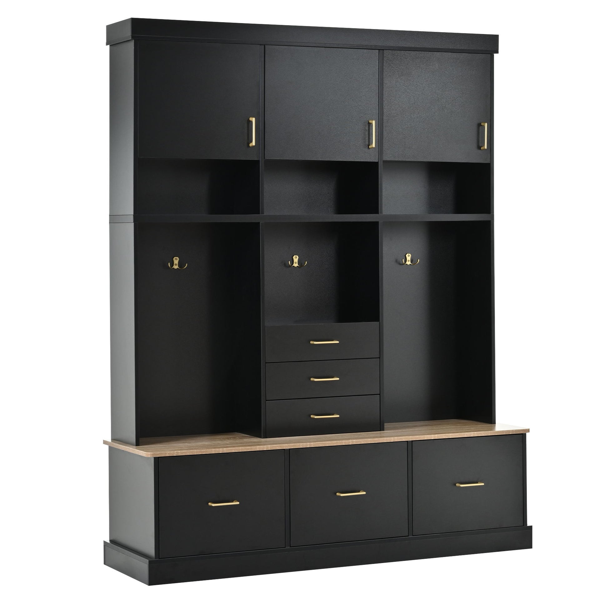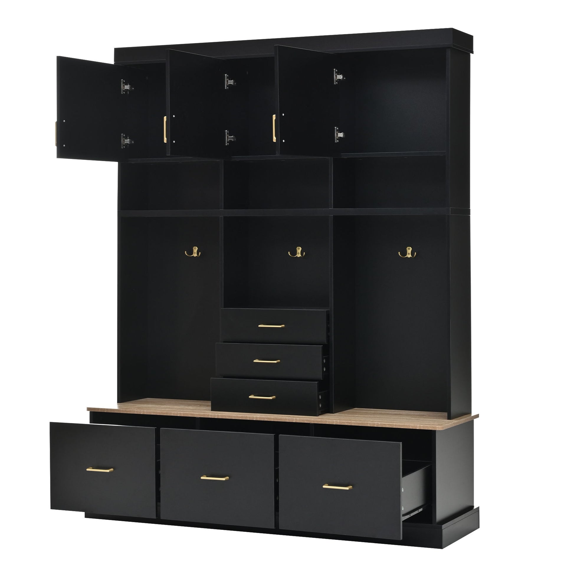 Entryway Hall Tree With Bench And Storage, 5 In 1 Coat Rack, 6 Drawers, 3 Cabinets And 3 Tier Top Storage - Black