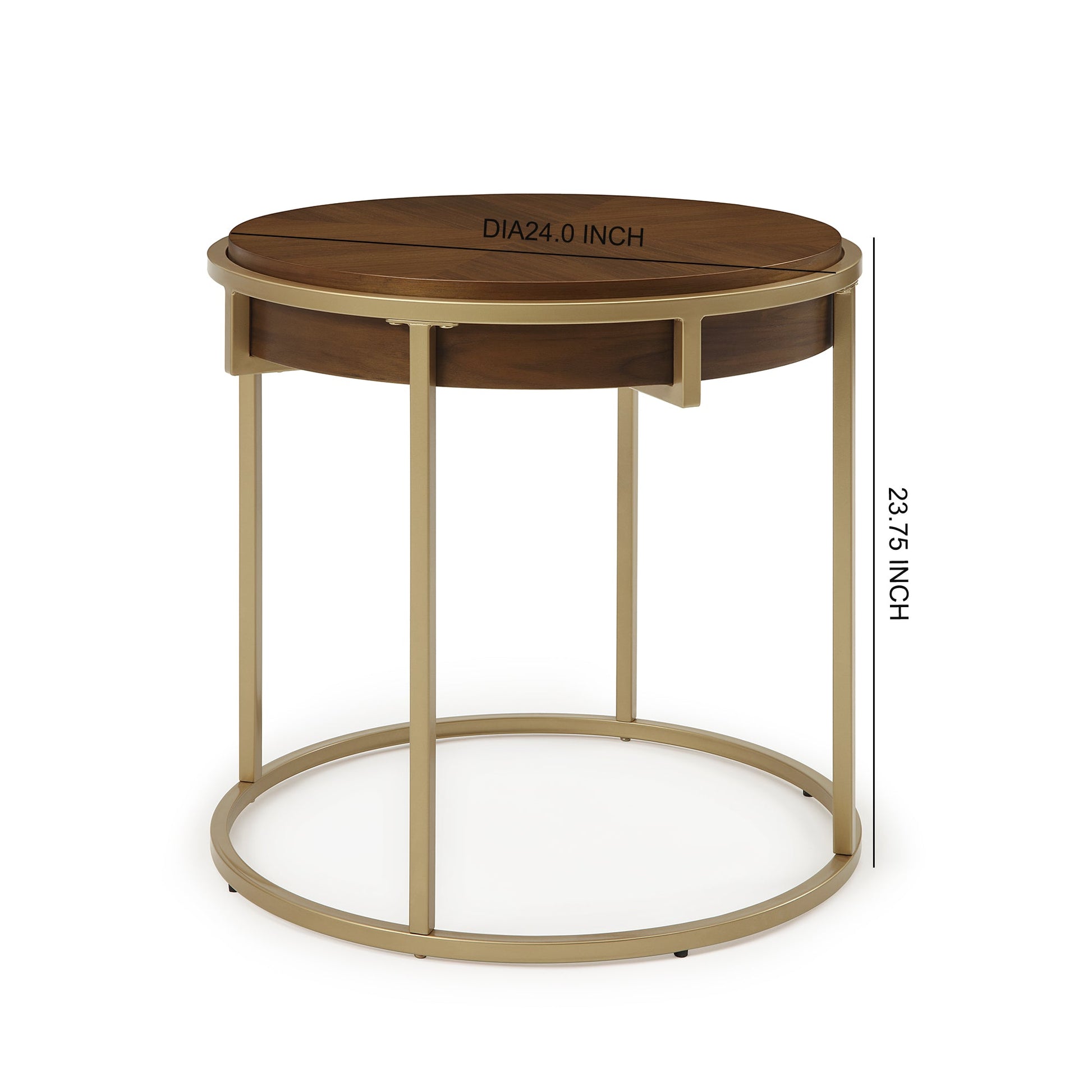 Enhance your living space with this Brown Top End Table, featuring a 24" round MDF and plywood top and a brushed gold metal base. Its compact size makes it perfect for small spaces, while the warm brown top pairs seamlessly with various décor styles. Ideal as a side or bedside table, it brings both function and modern elegance to any room.