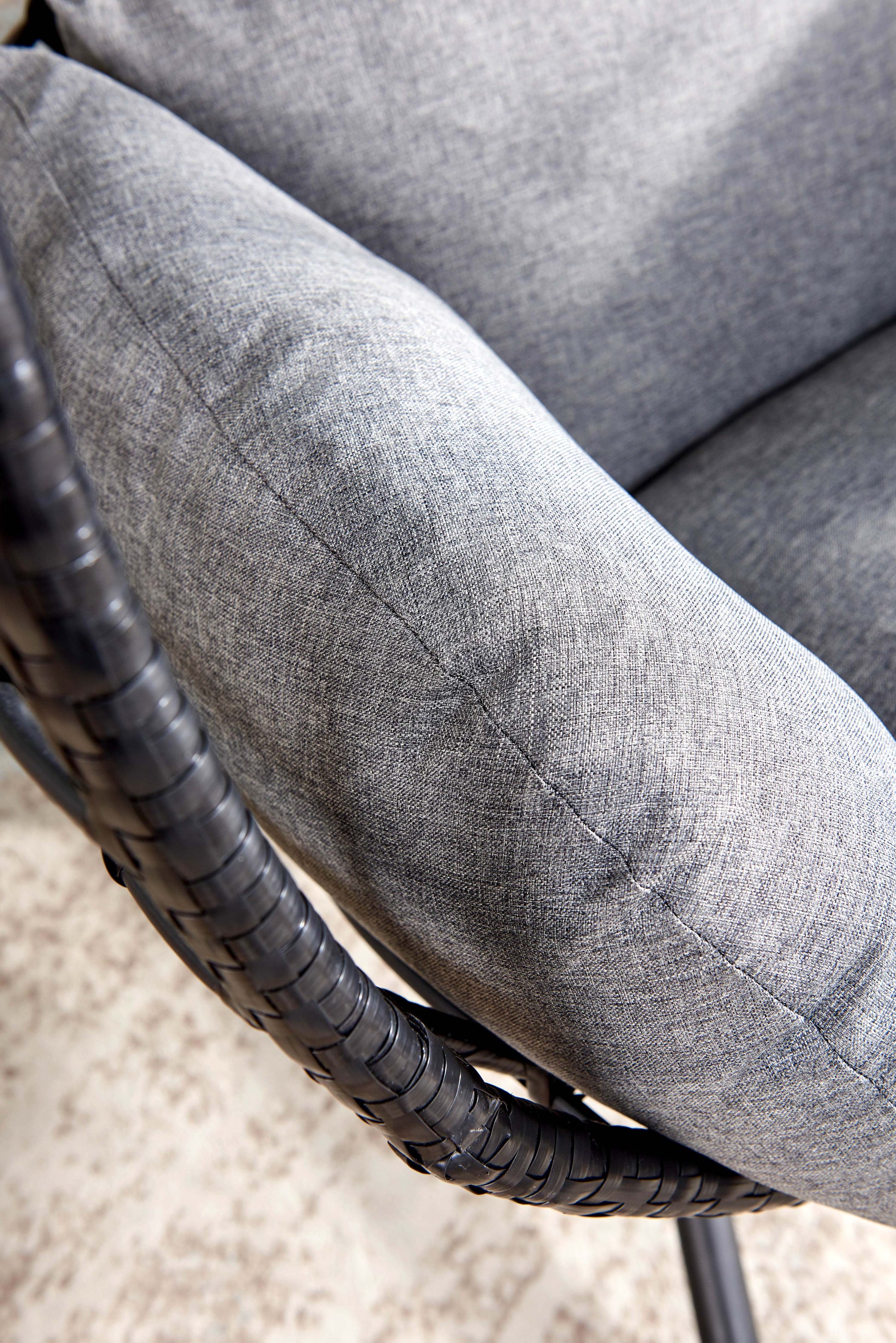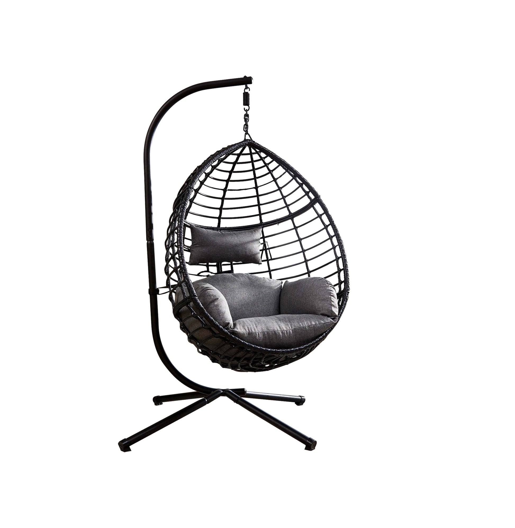 Relax and unwind in style with this durable hanging swing chair. Featuring a sturdy black powder-coated steel frame and weather-resistant PE rattan basket, this chair offers lasting durability for both indoor and outdoor use. The soft cushions in your choice of red or grey add a pop of color and extra comfort. With a weight capacity of up to 300 lbs, it’s perfect for lounging on your patio, balcony, or garden. Its dimensions of 37.4"L x 37.4"D x 76.8"H provide ample space for relaxation. Assembly is required, but the process is easy, ensuring you can enjoy your new favorite spot in no time.