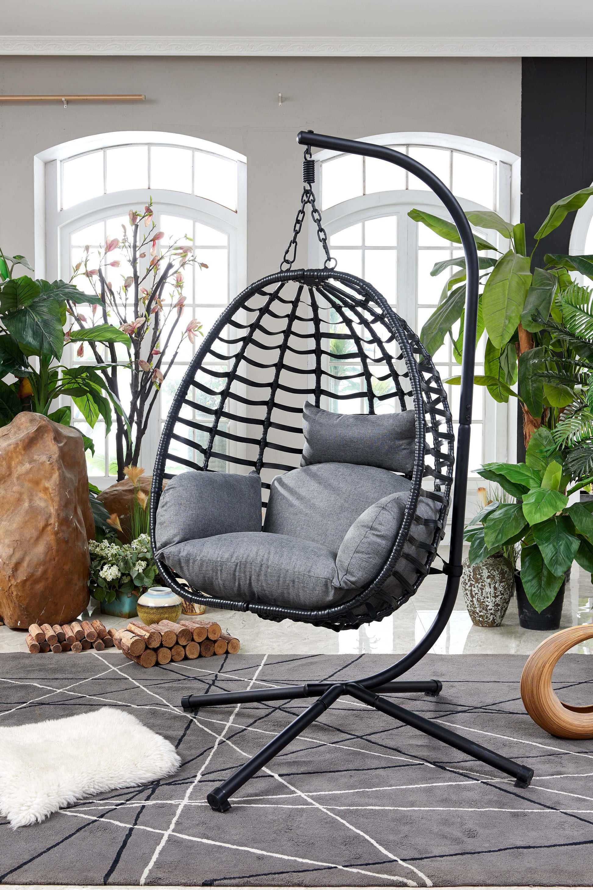 Relax in style with this modern swing chair, crafted for both comfort and elegance. Featuring a durable steel frame and a weather-resistant PE rattan basket, it supports up to 300 lbs for lasting stability. The soft, plush cushions in grey or red provide a cozy touch, allowing you to customize the chair to fit your décor. Ideal for creating a reading nook or a tranquil outdoor retreat, this swing chair is the perfect blend of luxury and durability. Assembly is required, but it is easy to set up and will quickly become a standout piece in your home.