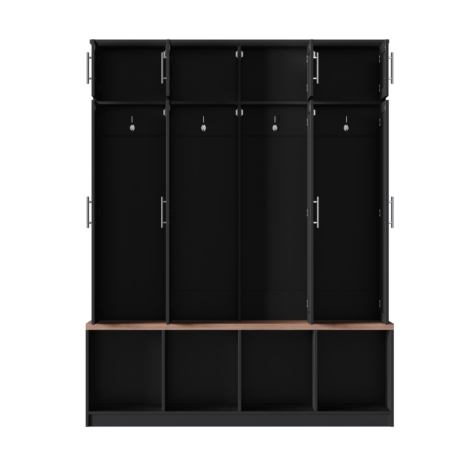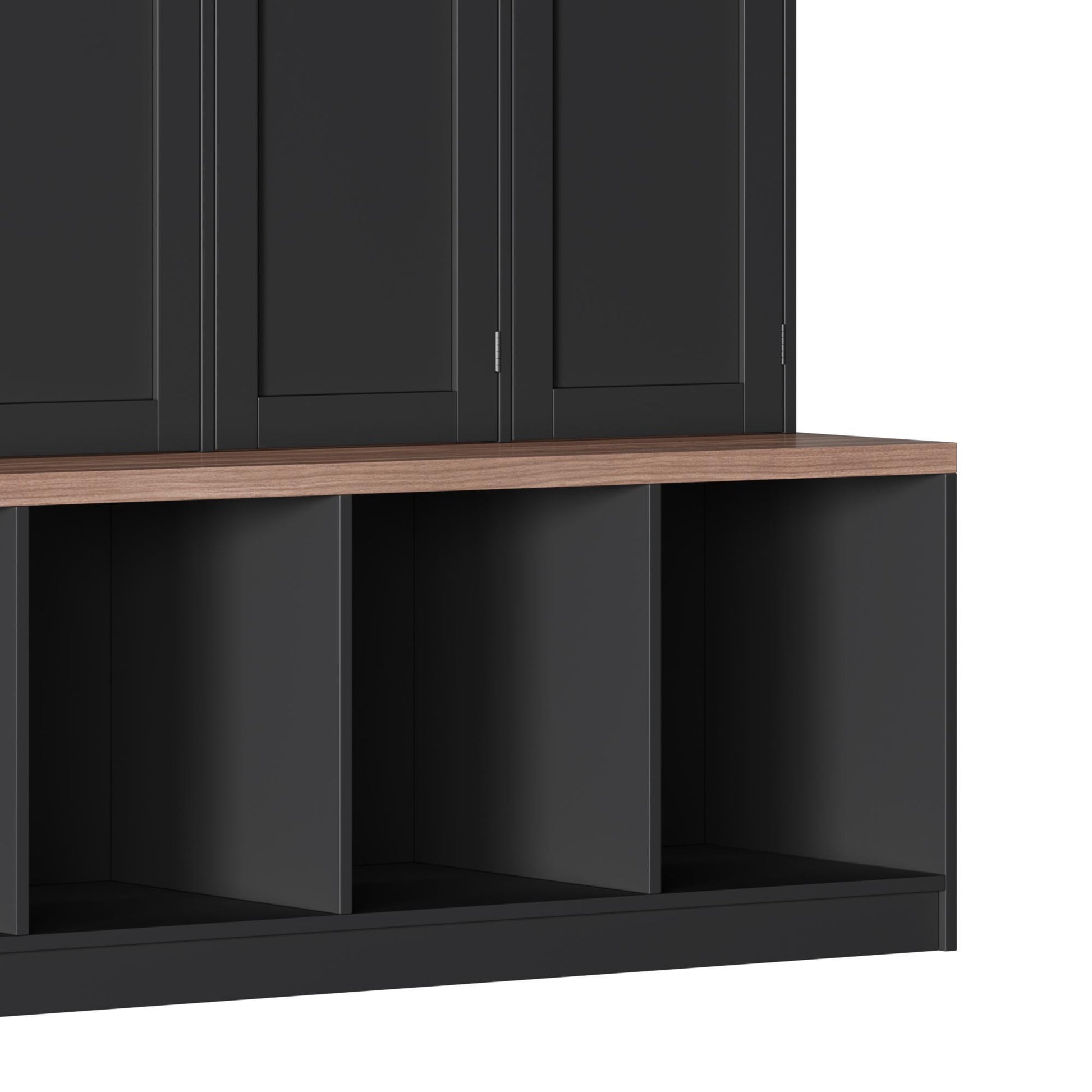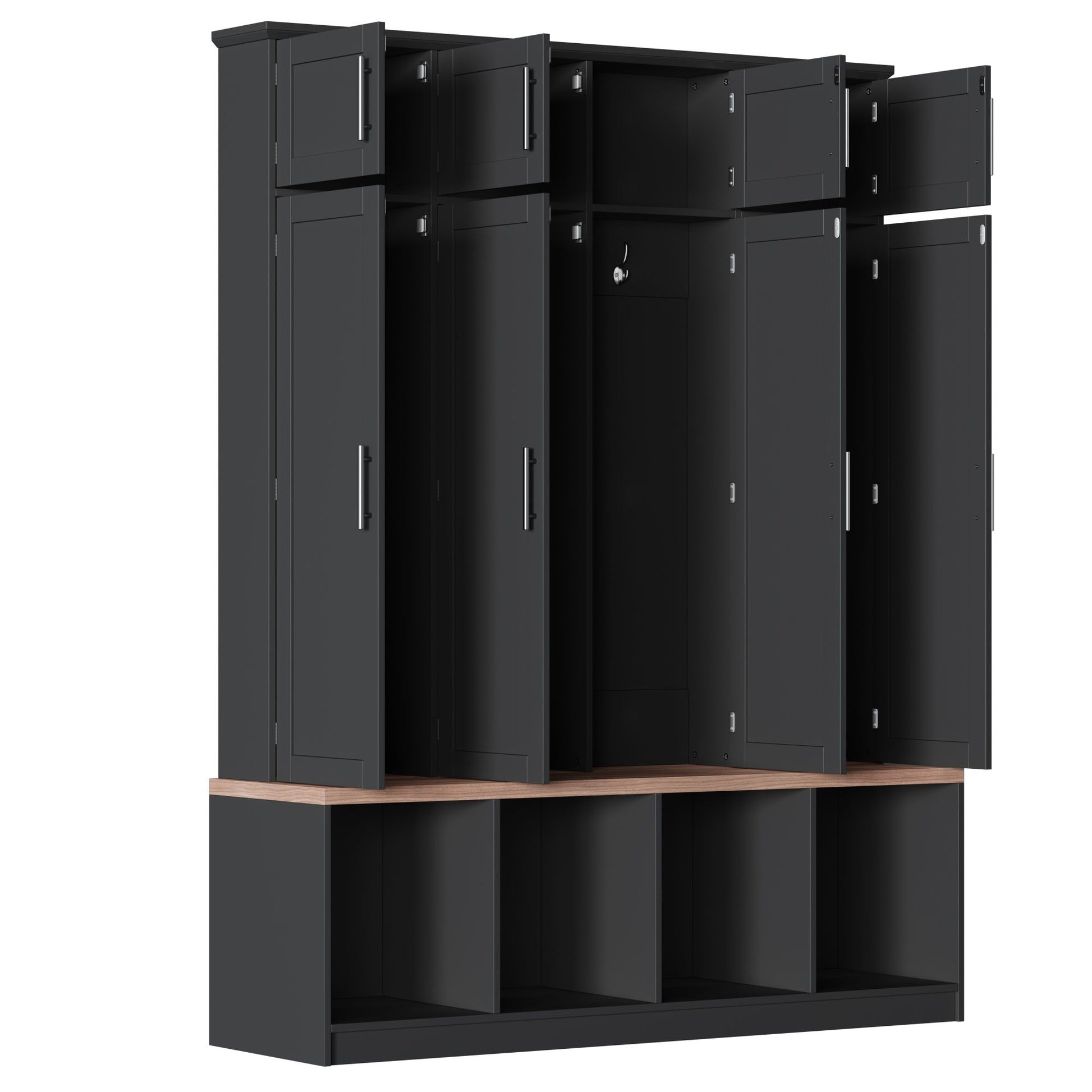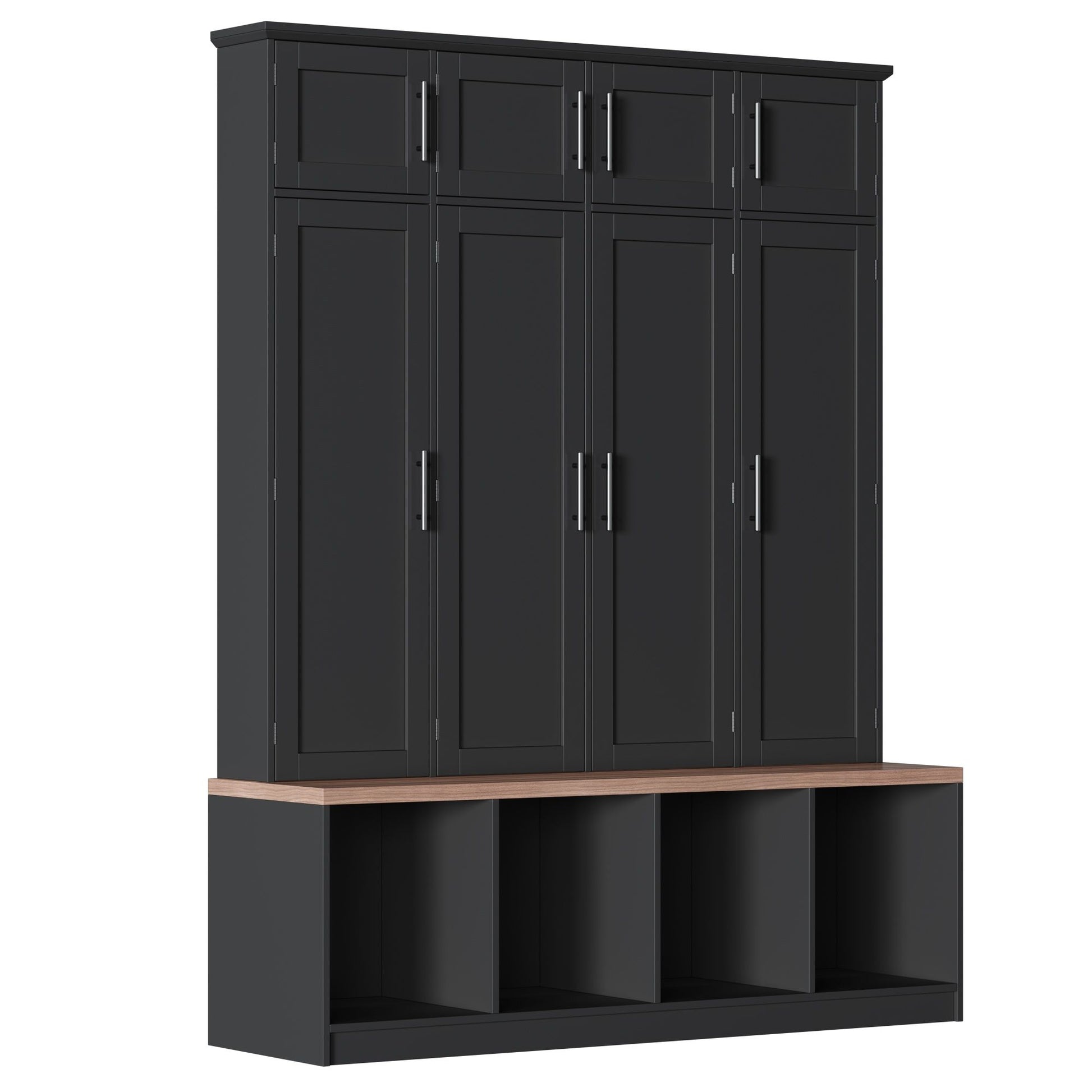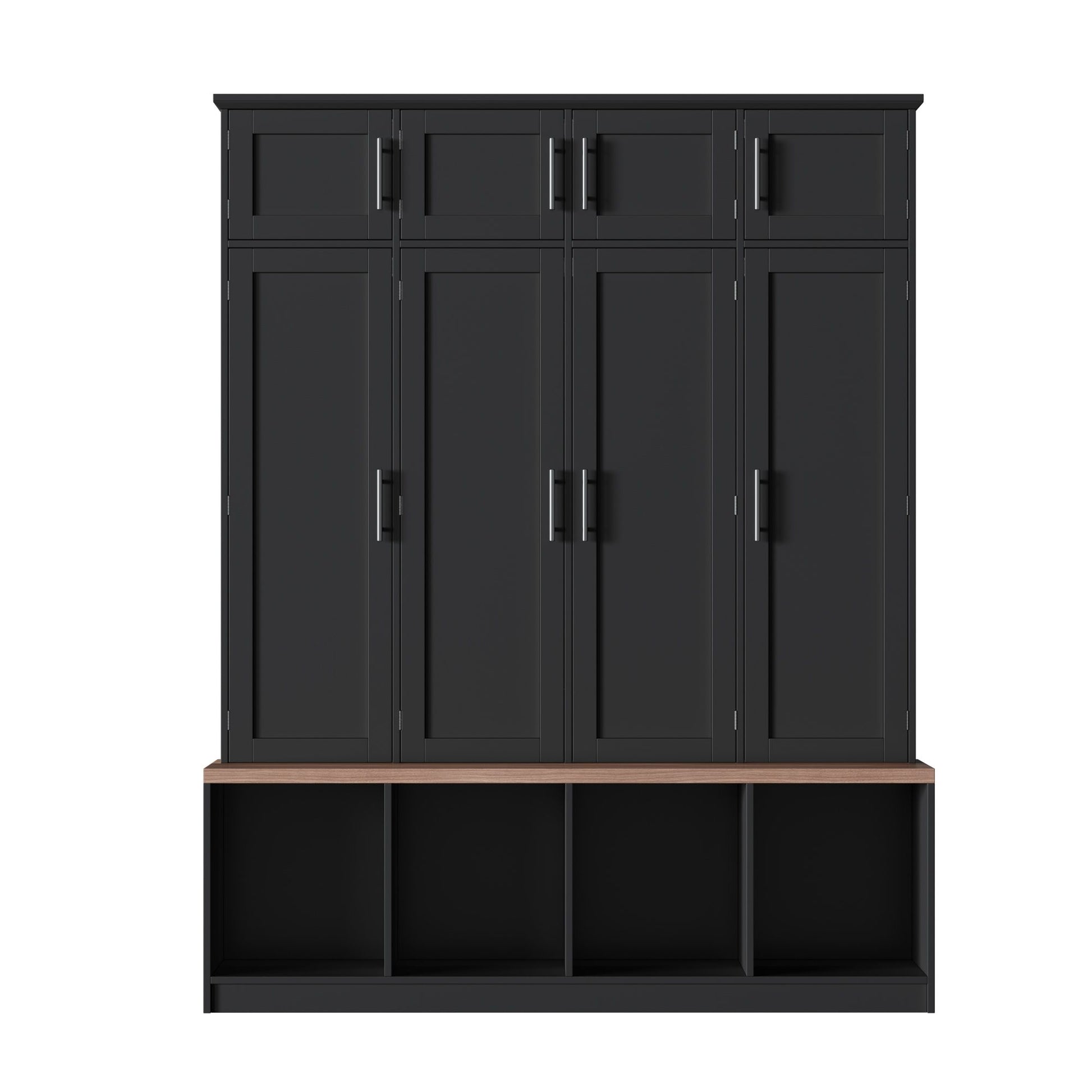 Farmhouse Hall Tree With 4 Hidden Hanging Hooks, Versatile Seating Bench With 8 Doors, Entryway Shoe Cabinet With Open Compartments For Living Room - Black