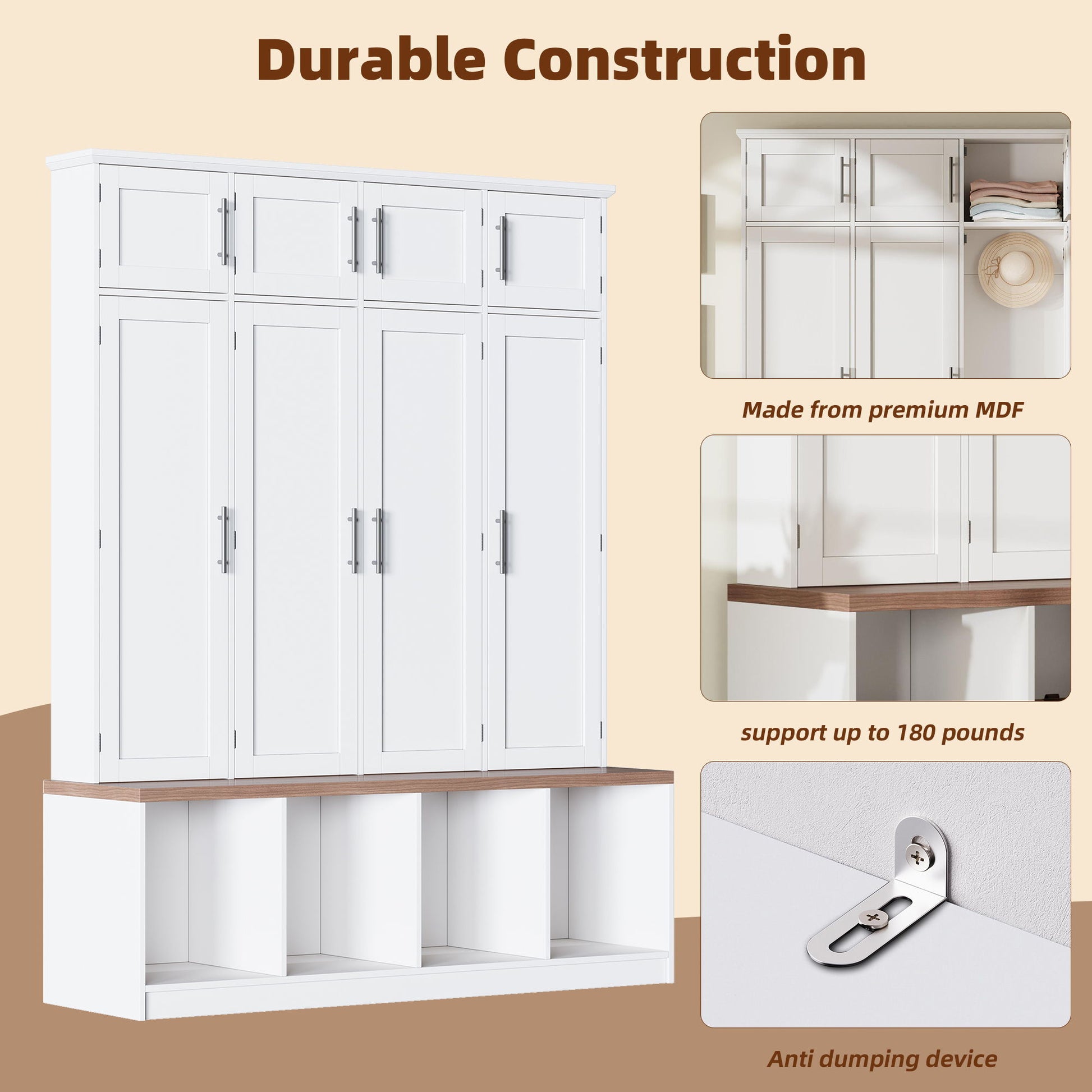 - Durable Construction: Made from premium MDF, this entryway cabinet is built to last. The sturdy frame and solid bench that can support up to 180 pounds, making it a durable and reliable choice for your entryway.