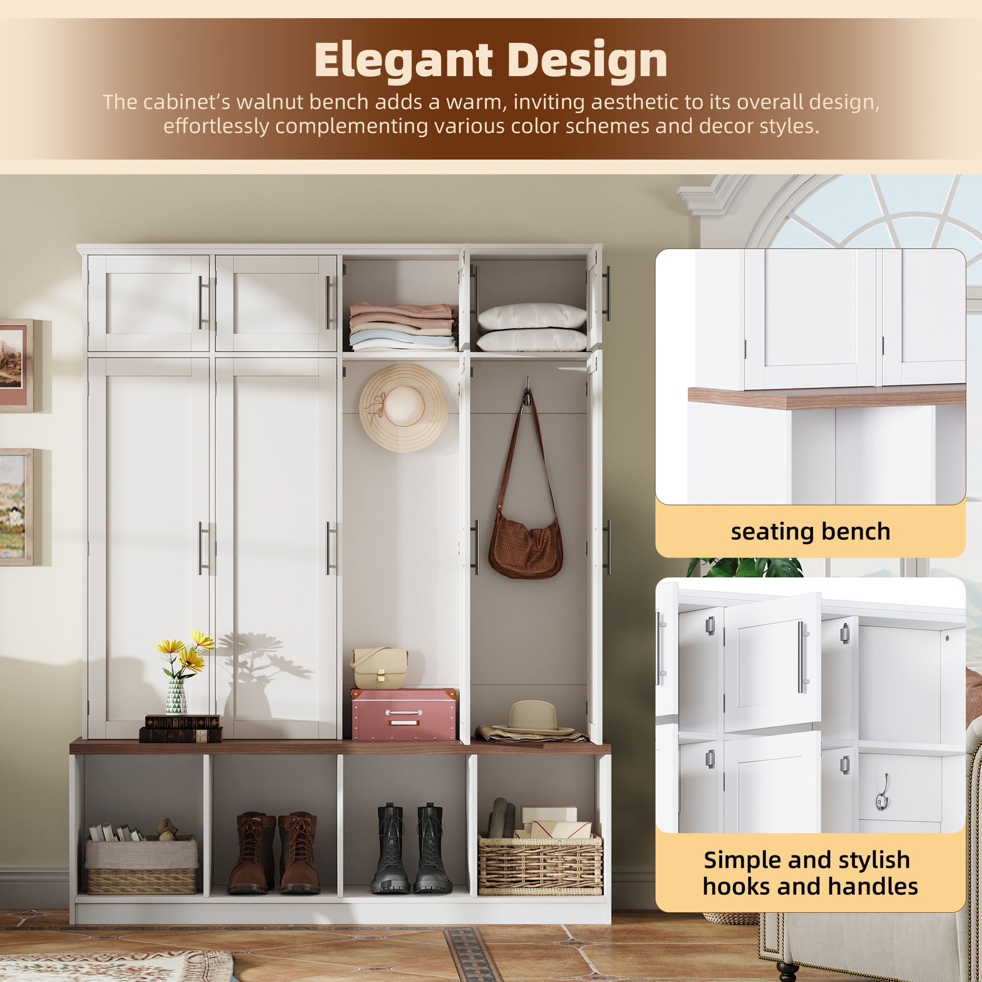 - Elegant Design: The cabinets walnut bench adds a warm, inviting aesthetic to its overall design, effortlessly complementing various color schemes and decor styles. The simple yet stylish hooks and handles give the entire hall tree a modern look.