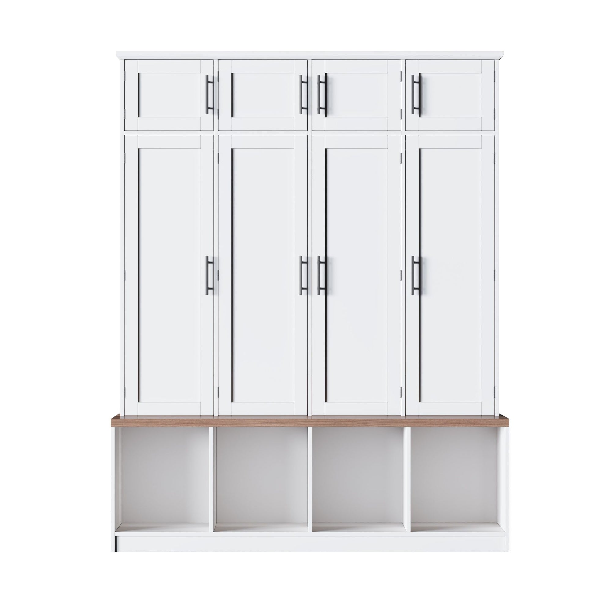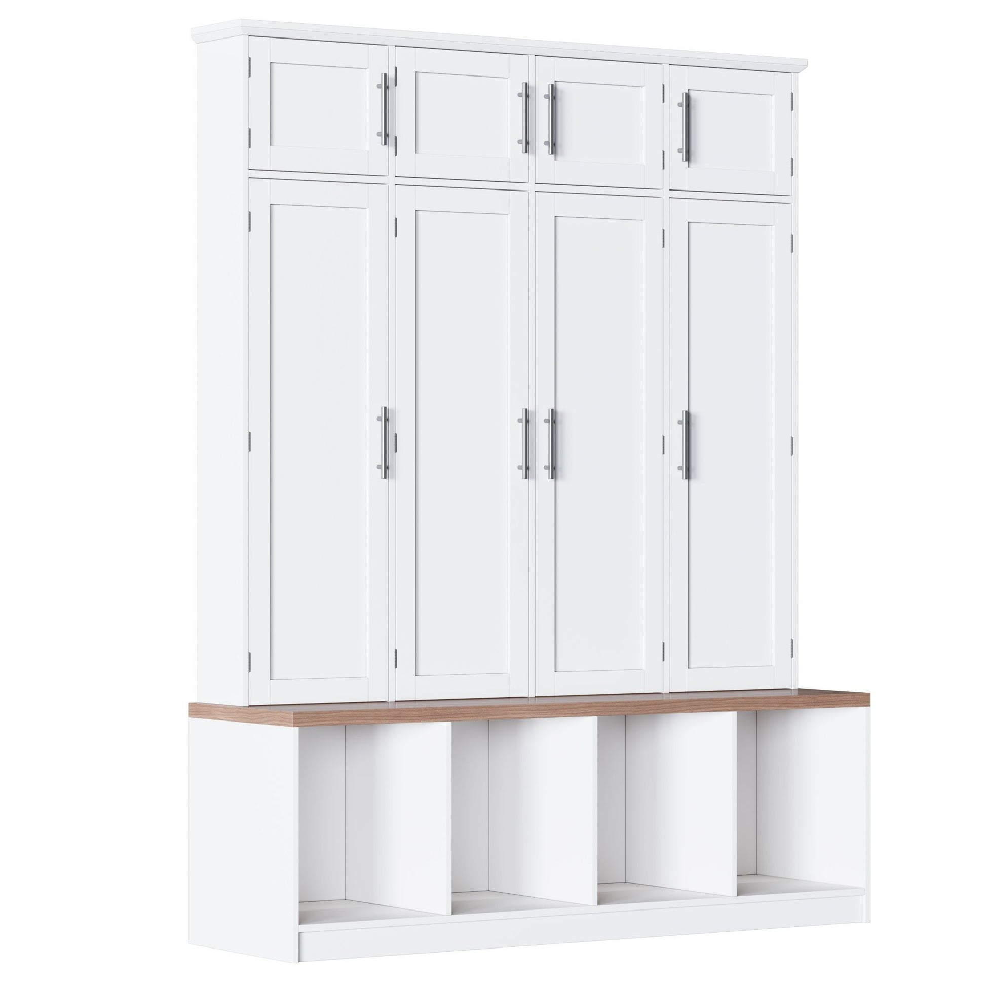 Farmhouse Hall Tree With 4 Hidden Hanging Hooks, Versatile Seating Bench With 8 Doors, Entryway Shoe Cabinet With Open Compartments For Living Room - White