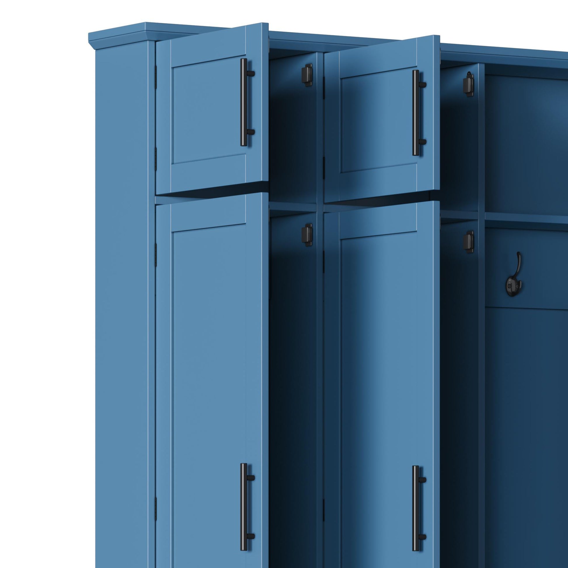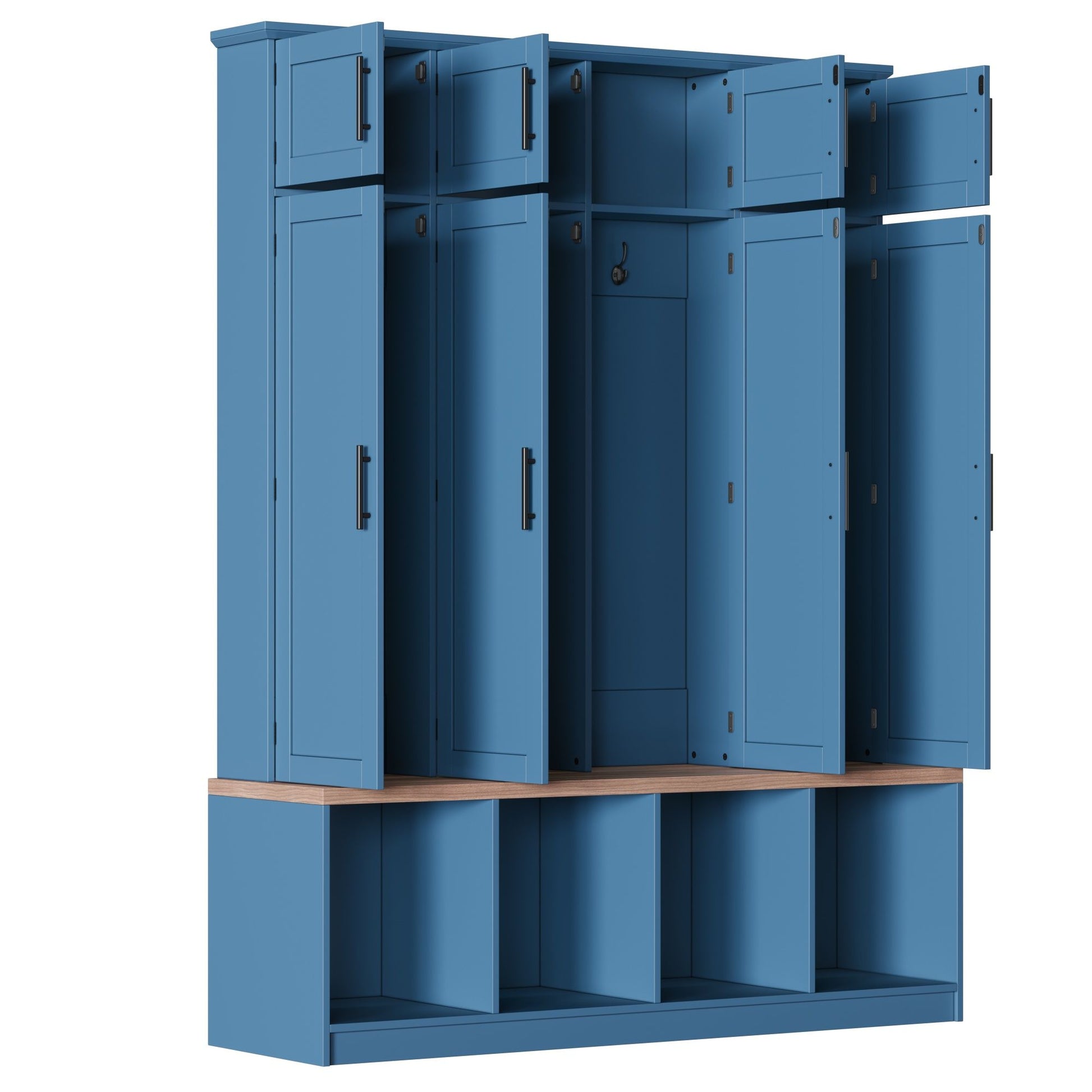Farmhouse Hall Tree With 4 Hidden Hanging Hooks, Versatile Seating Bench With 8 Doors, Entryway Shoe Cabinet With Open Compartments For Living Room - Blue