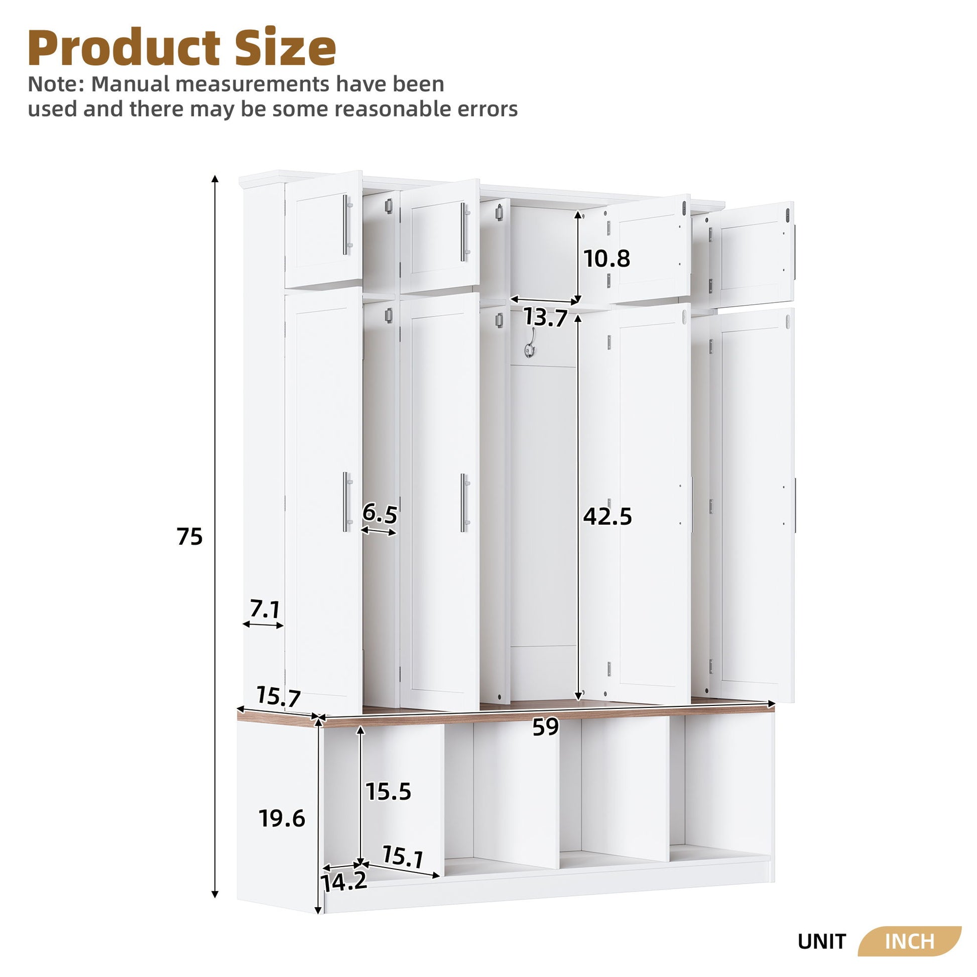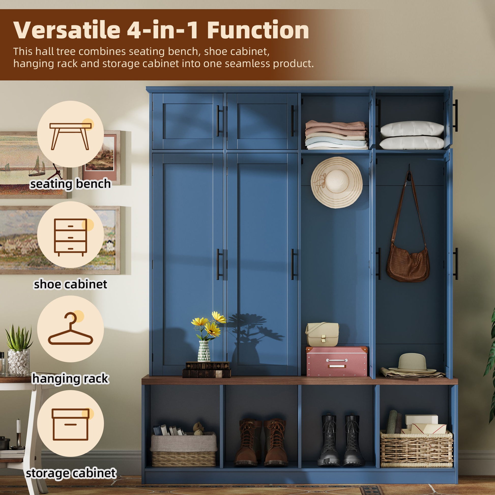 - Versatile 4-in-1 Function: This hall tree combines seating bench, shoe cabinet, hanging rack and storage cabinet into one seamless product. Whether you need a place to store things, or get a place to relax, this entryway cabinet can meet your needs.