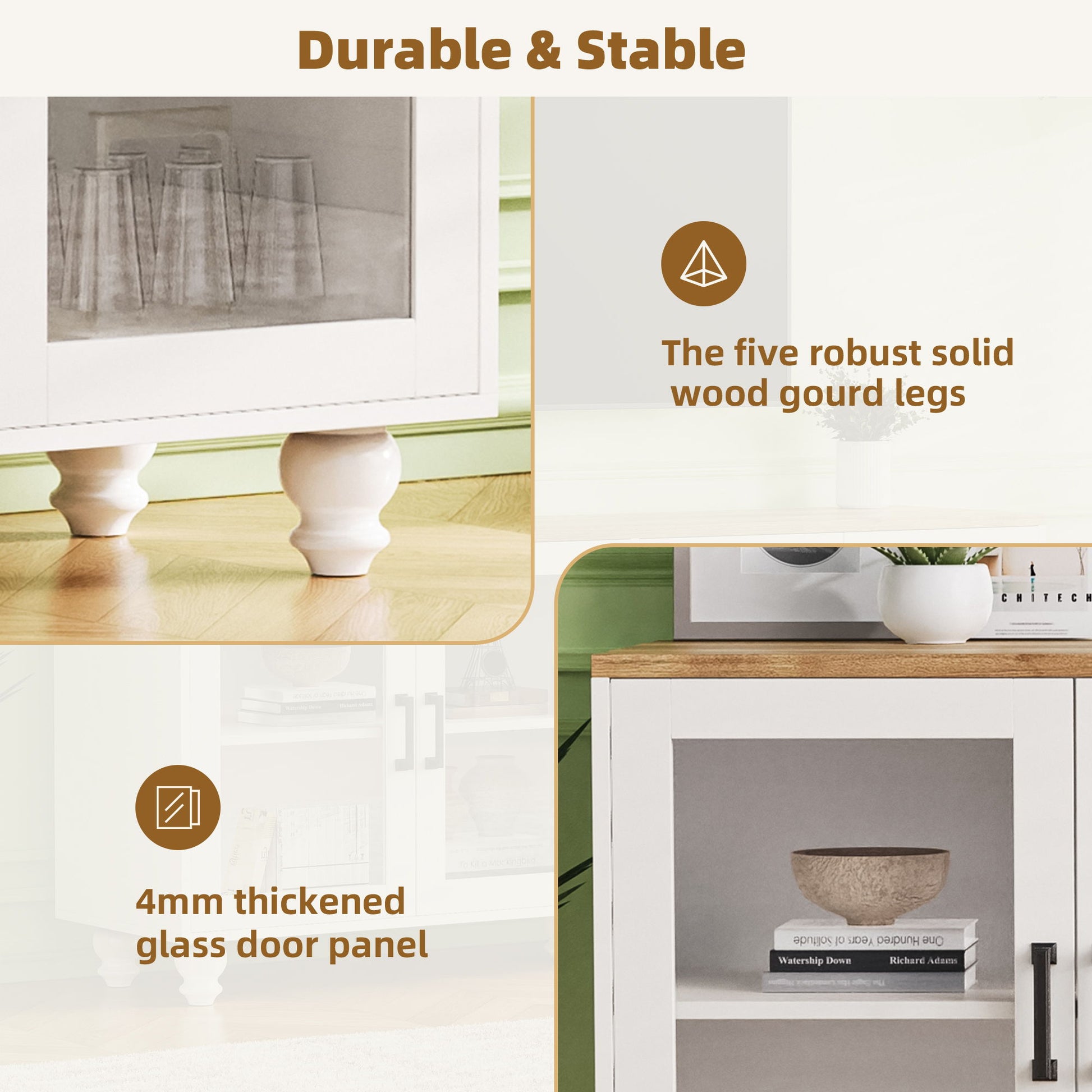 - Elegant Appearance: The vintage gourd-shaped legs and retro handles make this cabinet exude a refined classic elegance. The transparent glass door is also more suitable for displaying your collection, adding a sense of fashion and sophistication.