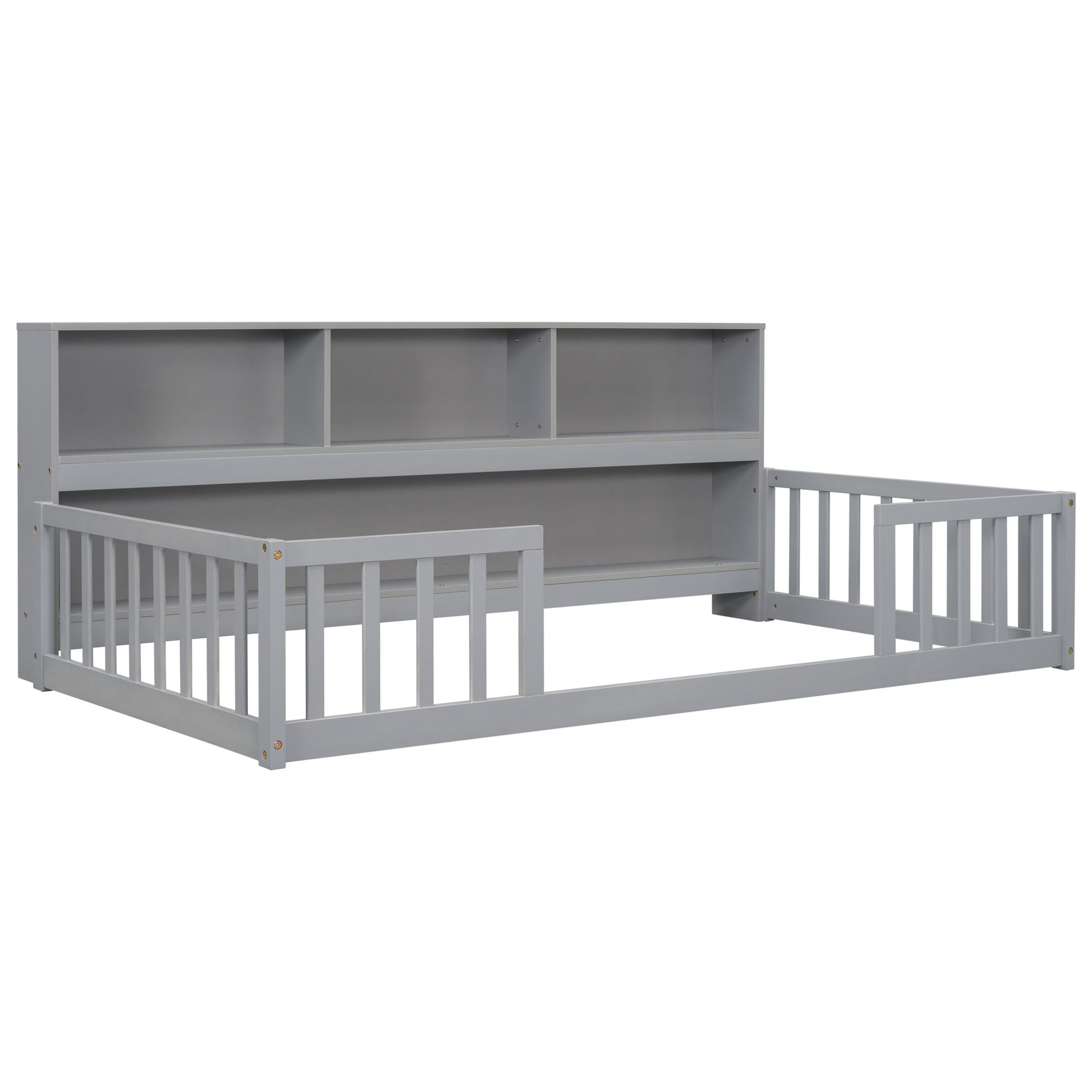 Twin Floor Bed With Bedside Bookcase, Shelves, Guardrails - Gray