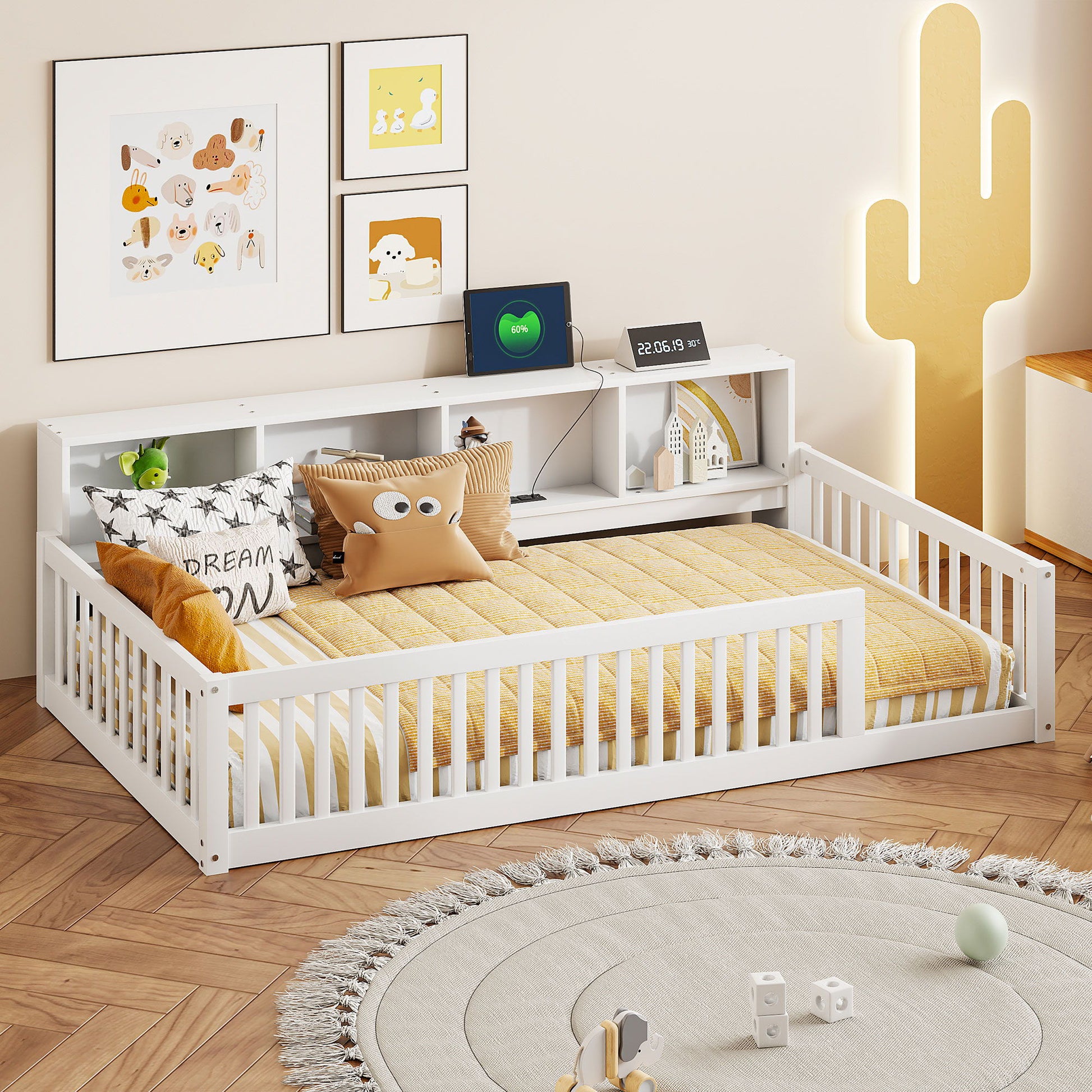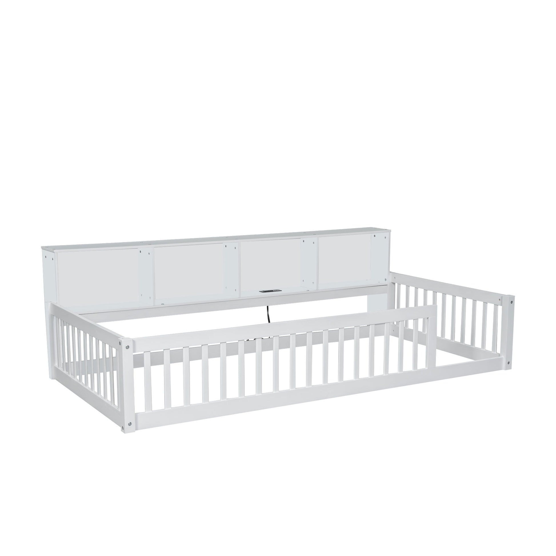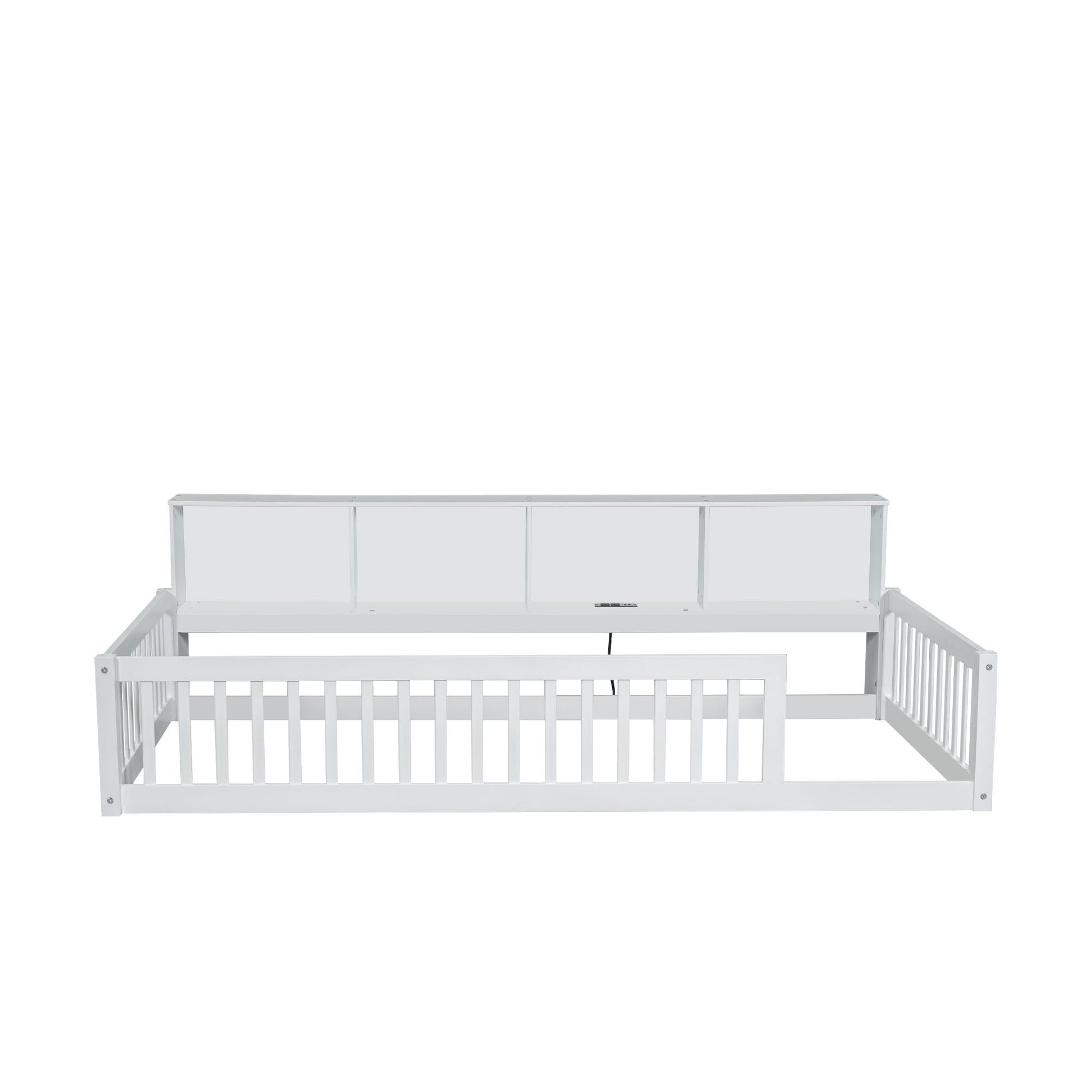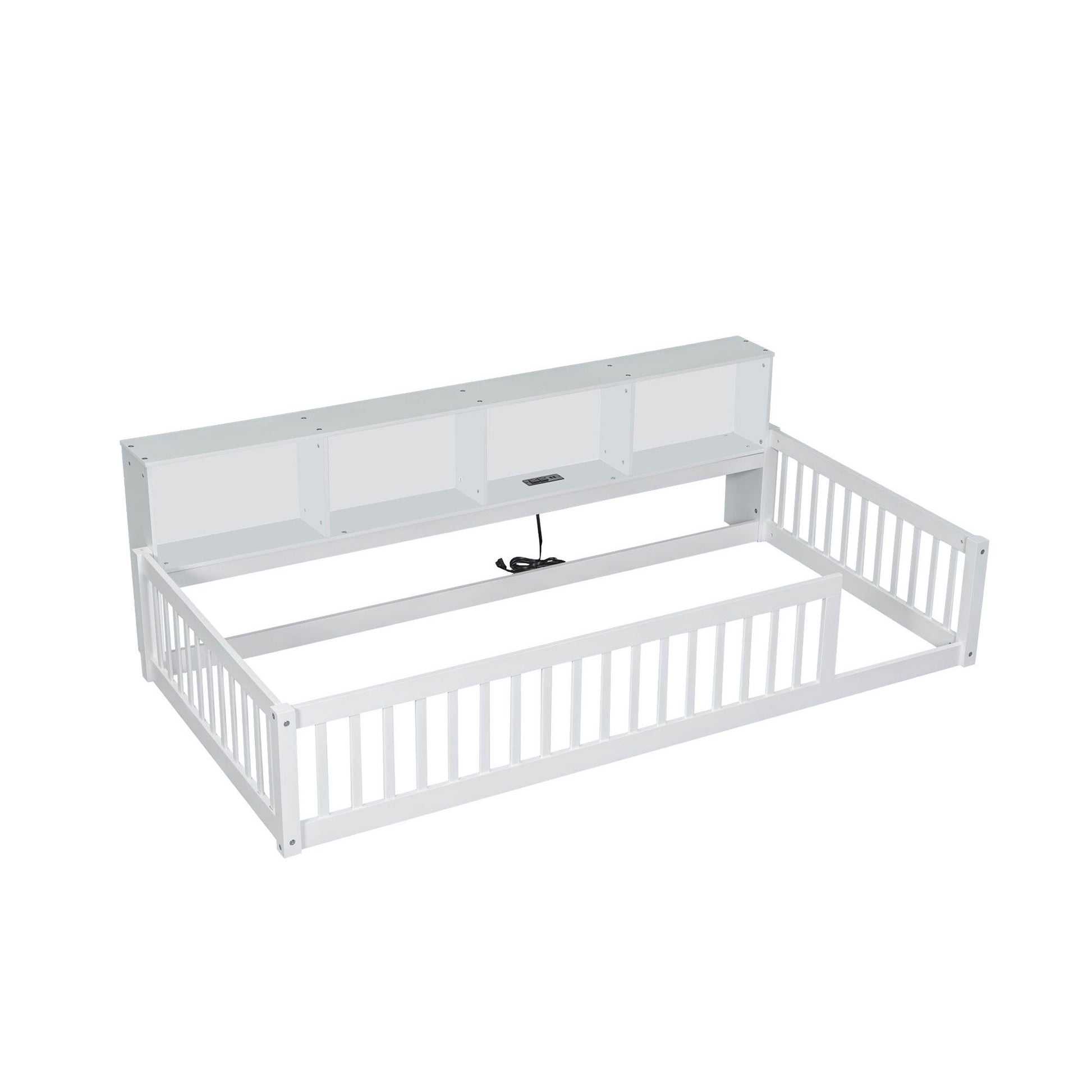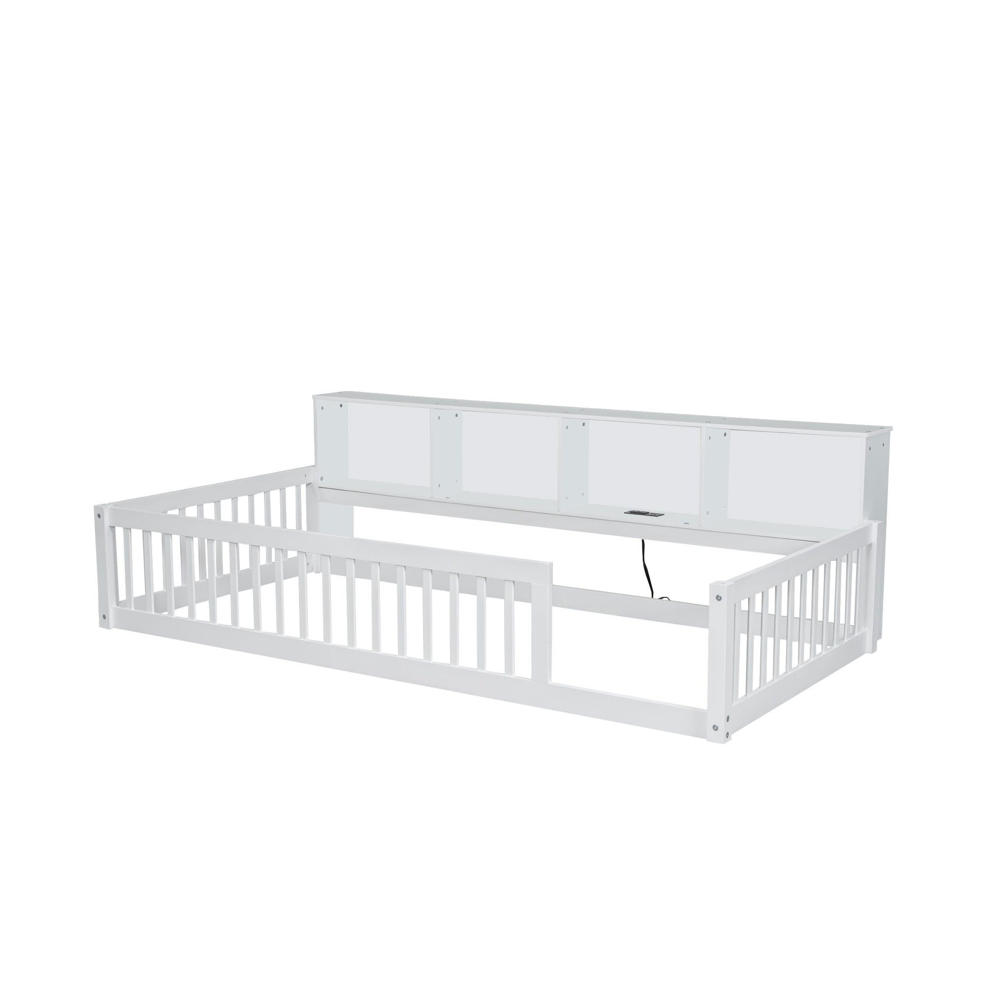 Twin Long Floor Bed With Storage Cabinets And USB Ports - White