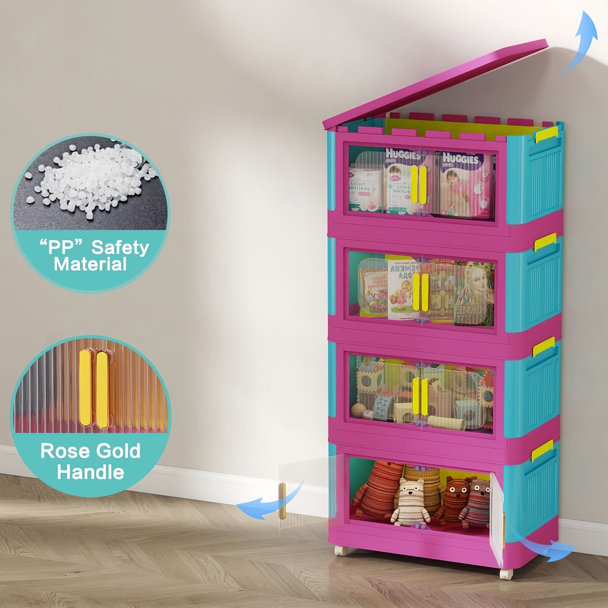 Happy Color Folding Storage Cabinet 5 Tier Wide Plastic With Magnetic Doors And Wheels - Pink / Blue