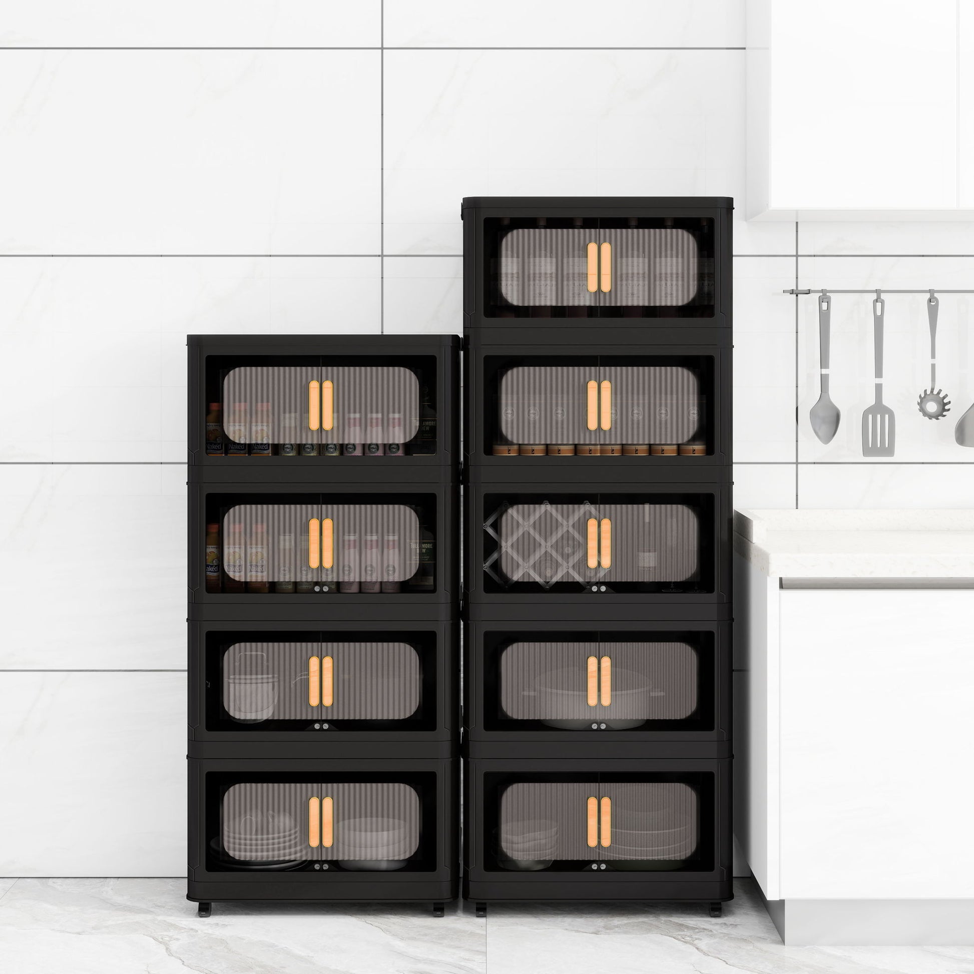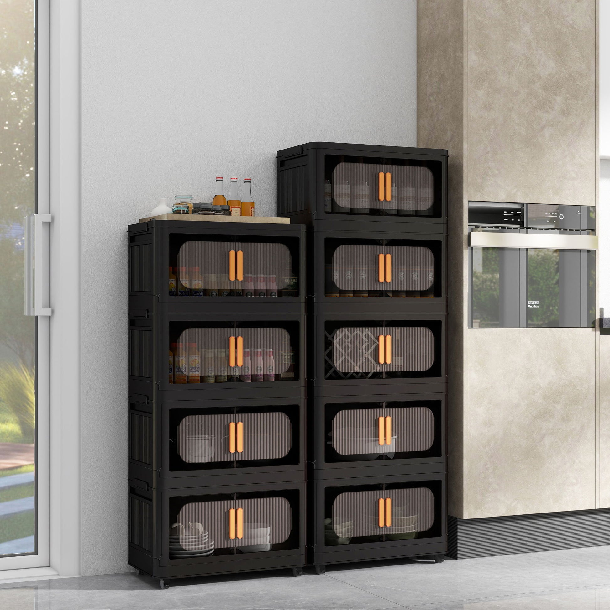 Folding Storage Cabinet 5 Tier Wide Plastic With Magnetic Doors And Wheels - Black