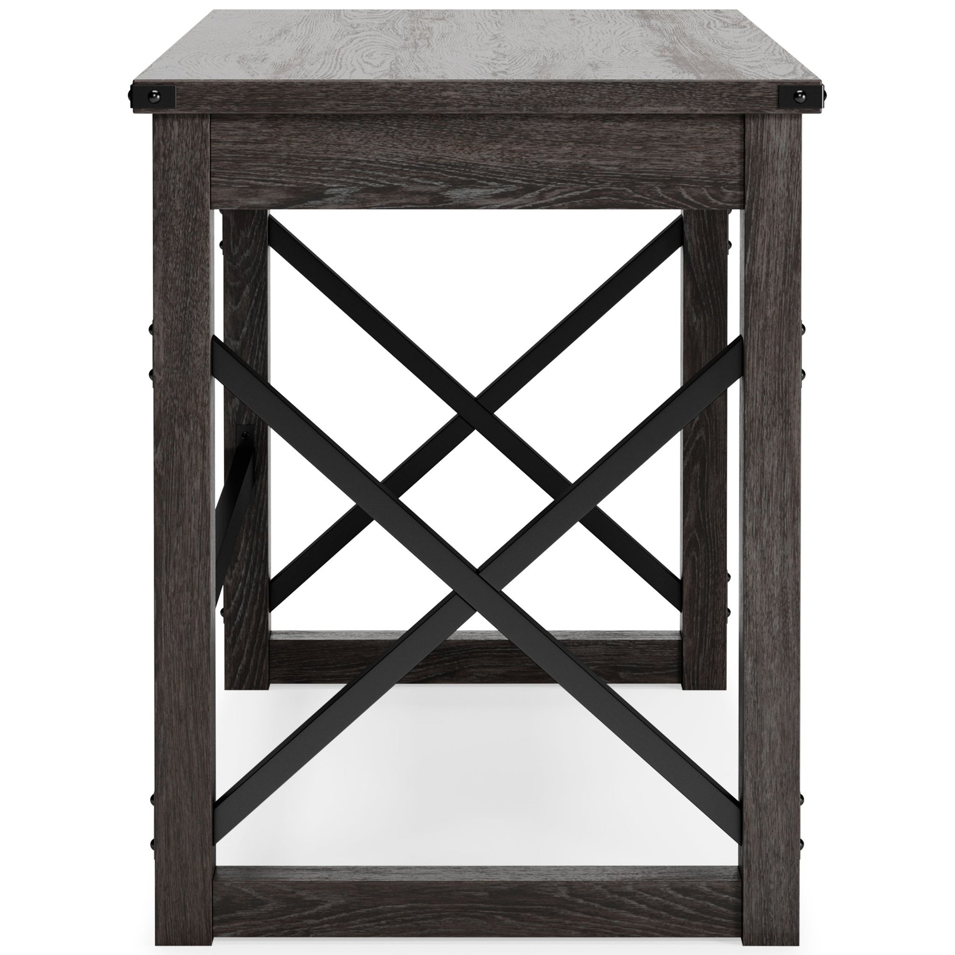 - Cross-buck rails, metal accents and stretcher in contrasting black iron tone