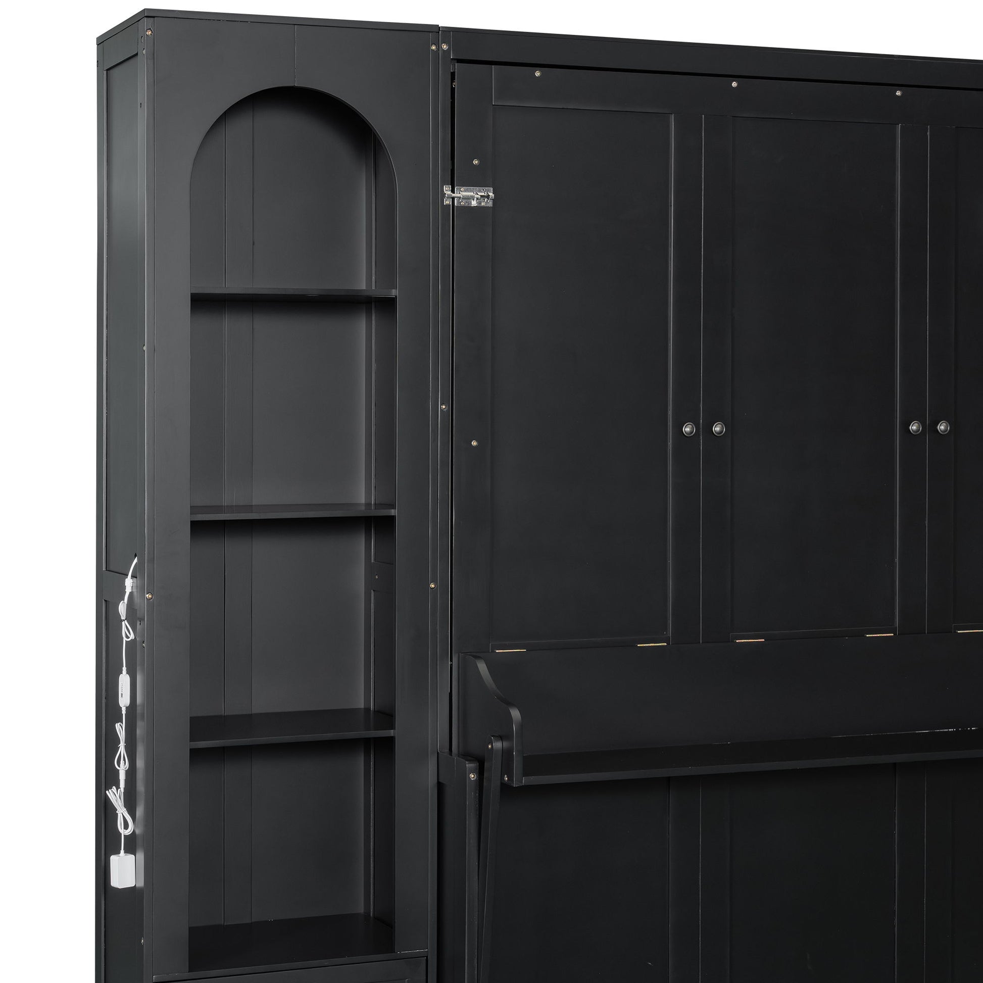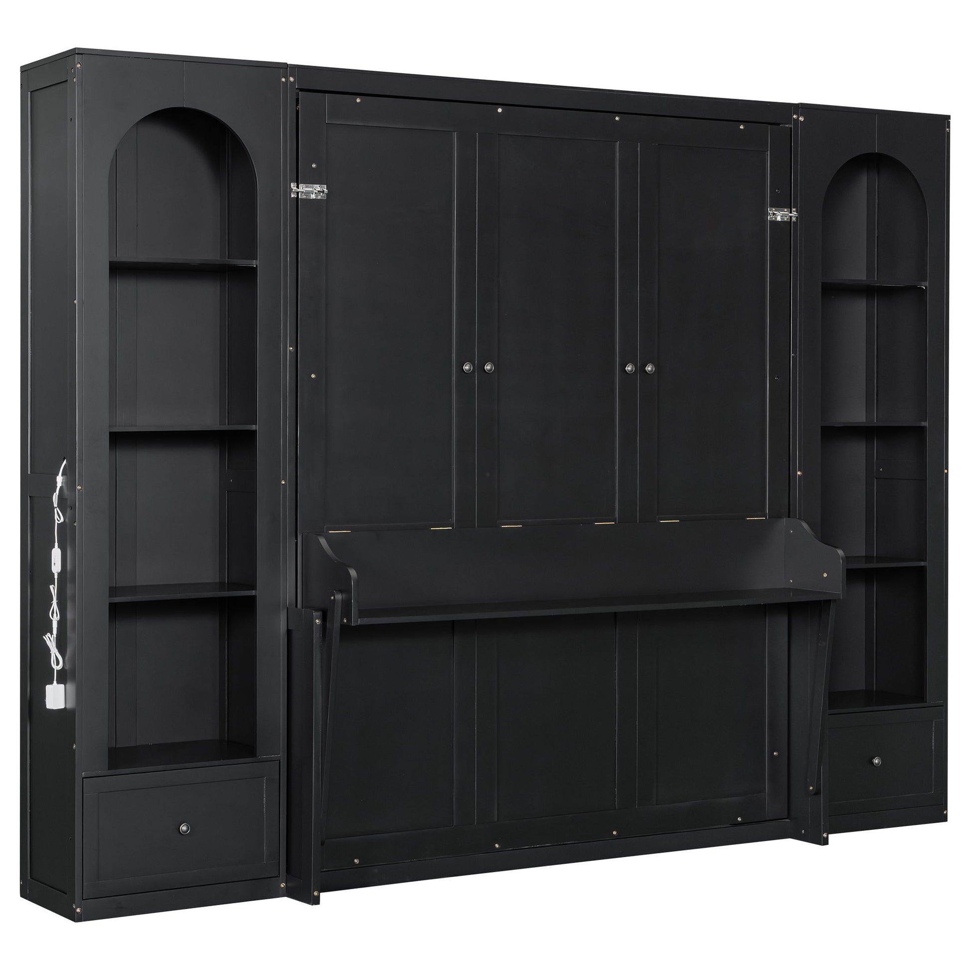 Queen Size Murphy Platform Bed With Shelf, Side Cabinets, Drawers And LED - Black