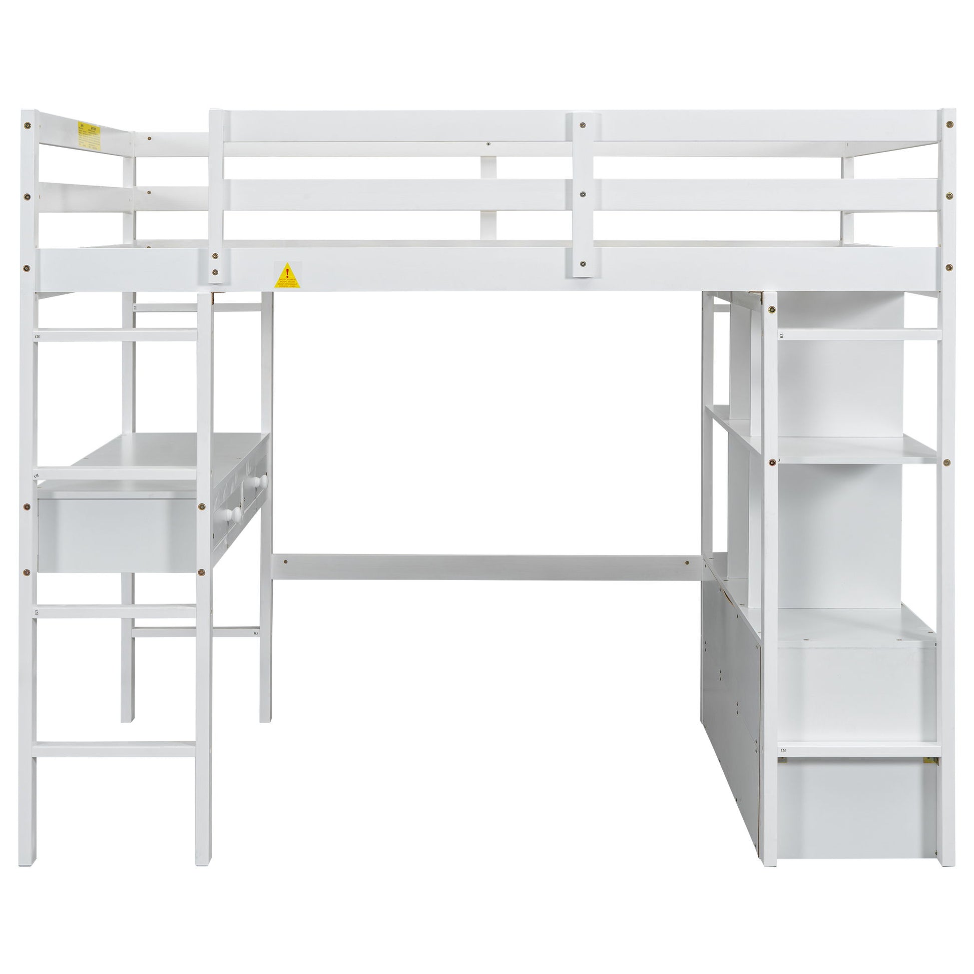 Full Size Loft Bed With Built In Desk, 2 Drawers, Storage Shelves - White