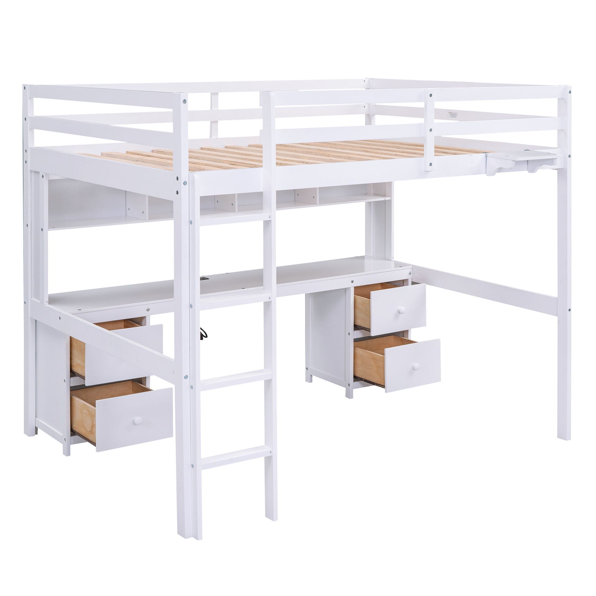 Full Size Loft Bed With Desk, Cabinets, Drawers, Charging Station And Bedside Tray, Sturdy Frame, No Box Spring Required - White