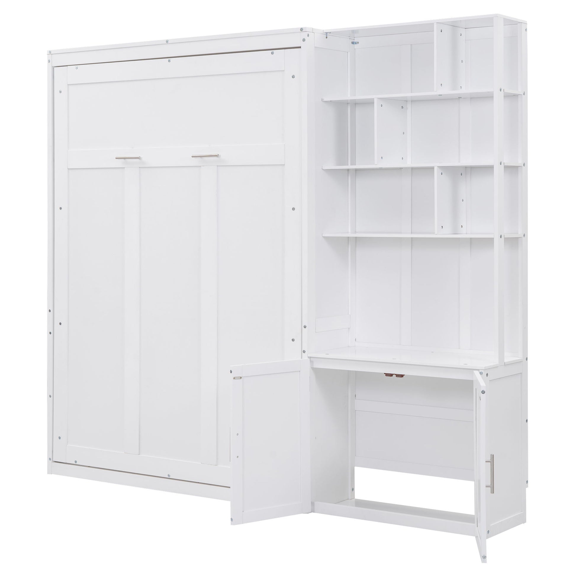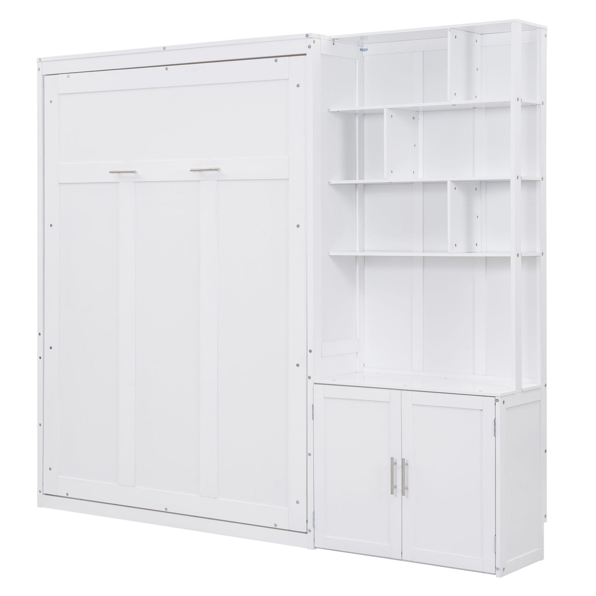 Full Size Murphy Bed With Multiple Storage Shelves And A Cabinet - White