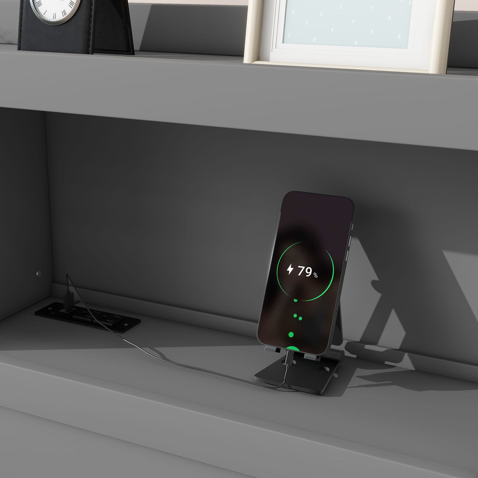 Full Size Platform Bed With Trundle, Drawers, USB Ports And Built In Shelves - Gray