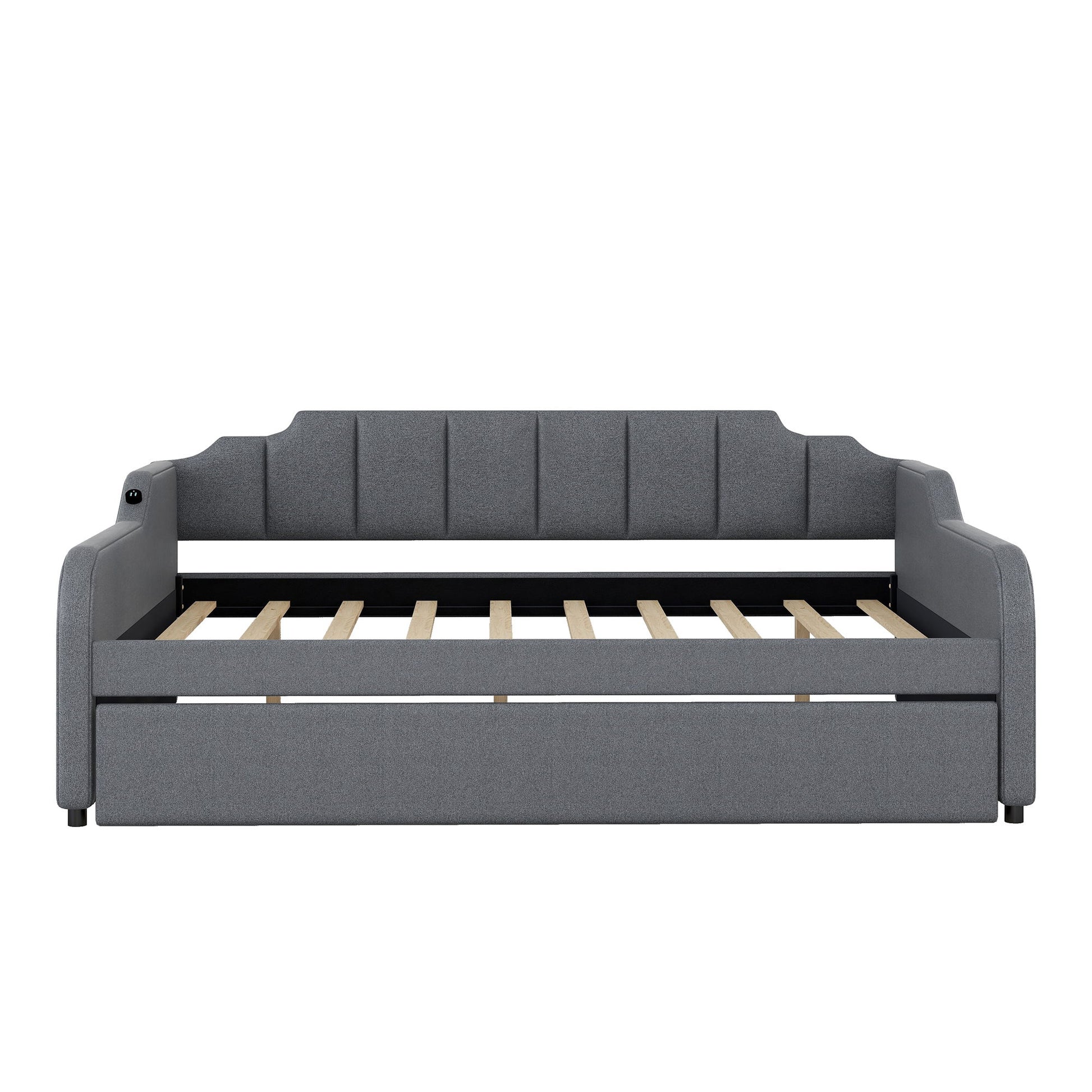 Full Size Upholstered Daybed With Trundle And USB Charging - Gray