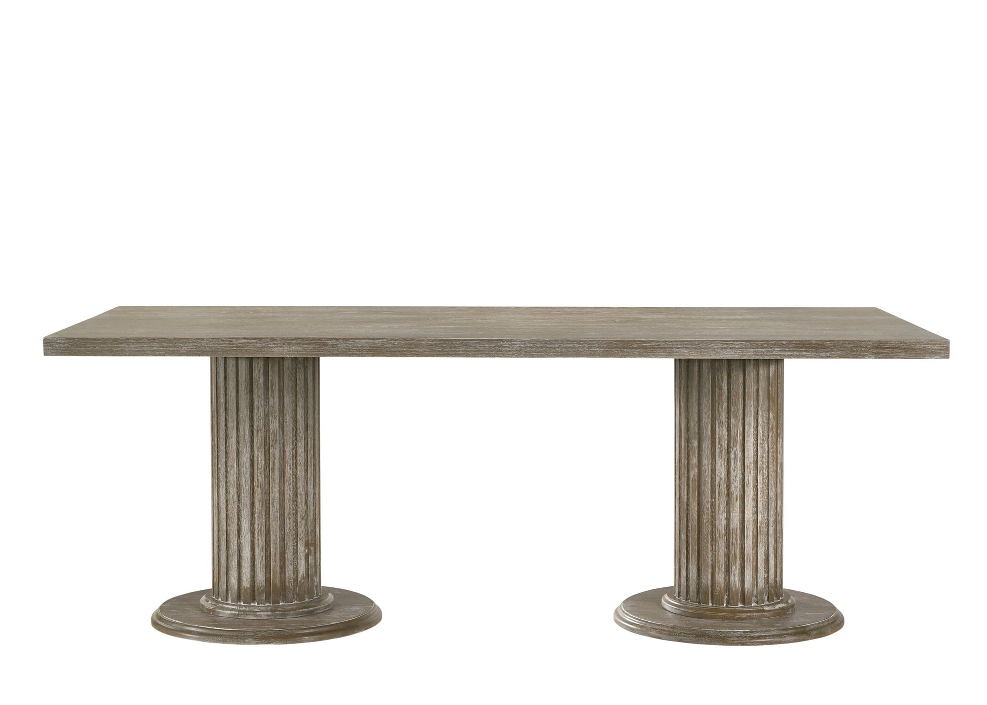 - Elegant Double Pedestal Design: This dining table features a rectangular design with a sturdy wooden pedestal base, adorned with fluted column details that offer a touch of timeless sophistication to your dining area.
