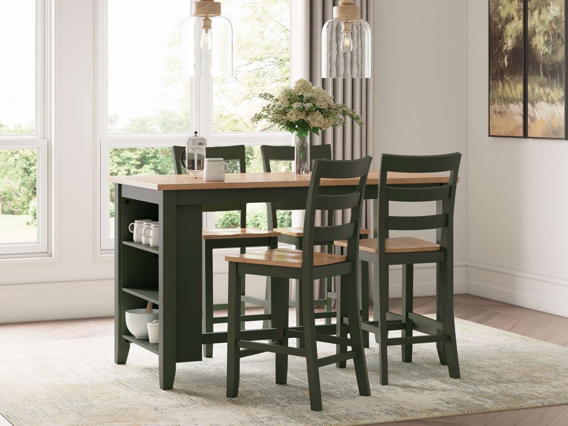 Gesthaven - 5 Pc. - Rectangular Dining Room Counter Table, 4 Barstools - Natural / Green