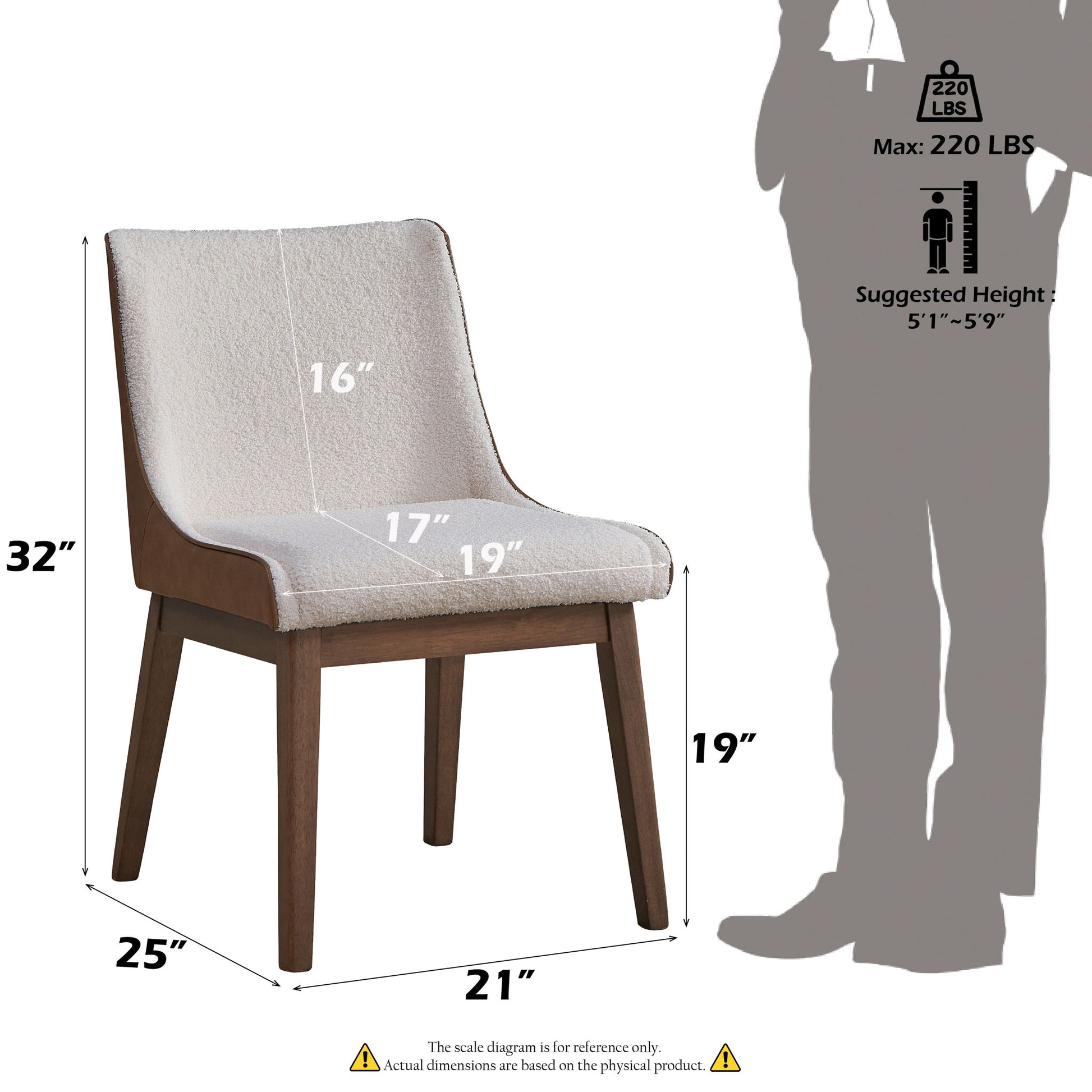 - Chair Design and Material: Each dining chair is designed with dimensions of 25" D x 21" W x 32" H, featuring a seat width of 19", depth of 17", and height of 19". They are crafted from rubber wood, MDF, boucle, velvet, and foam.