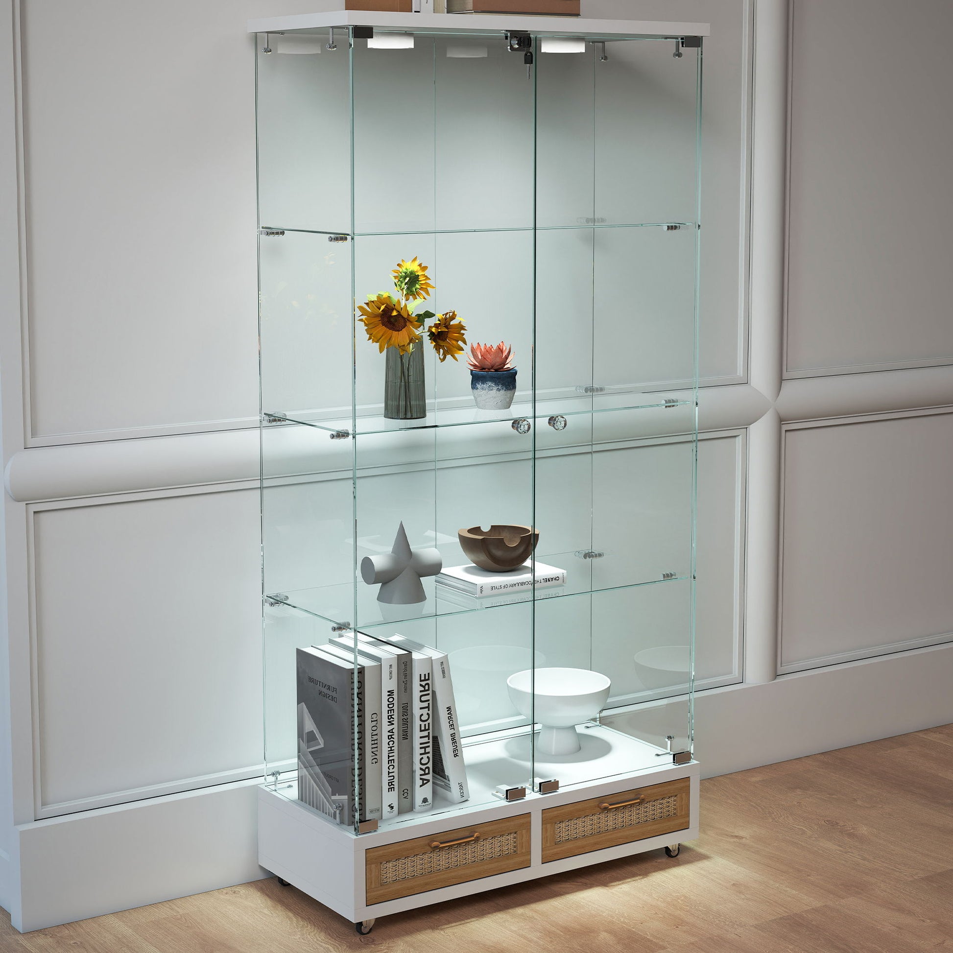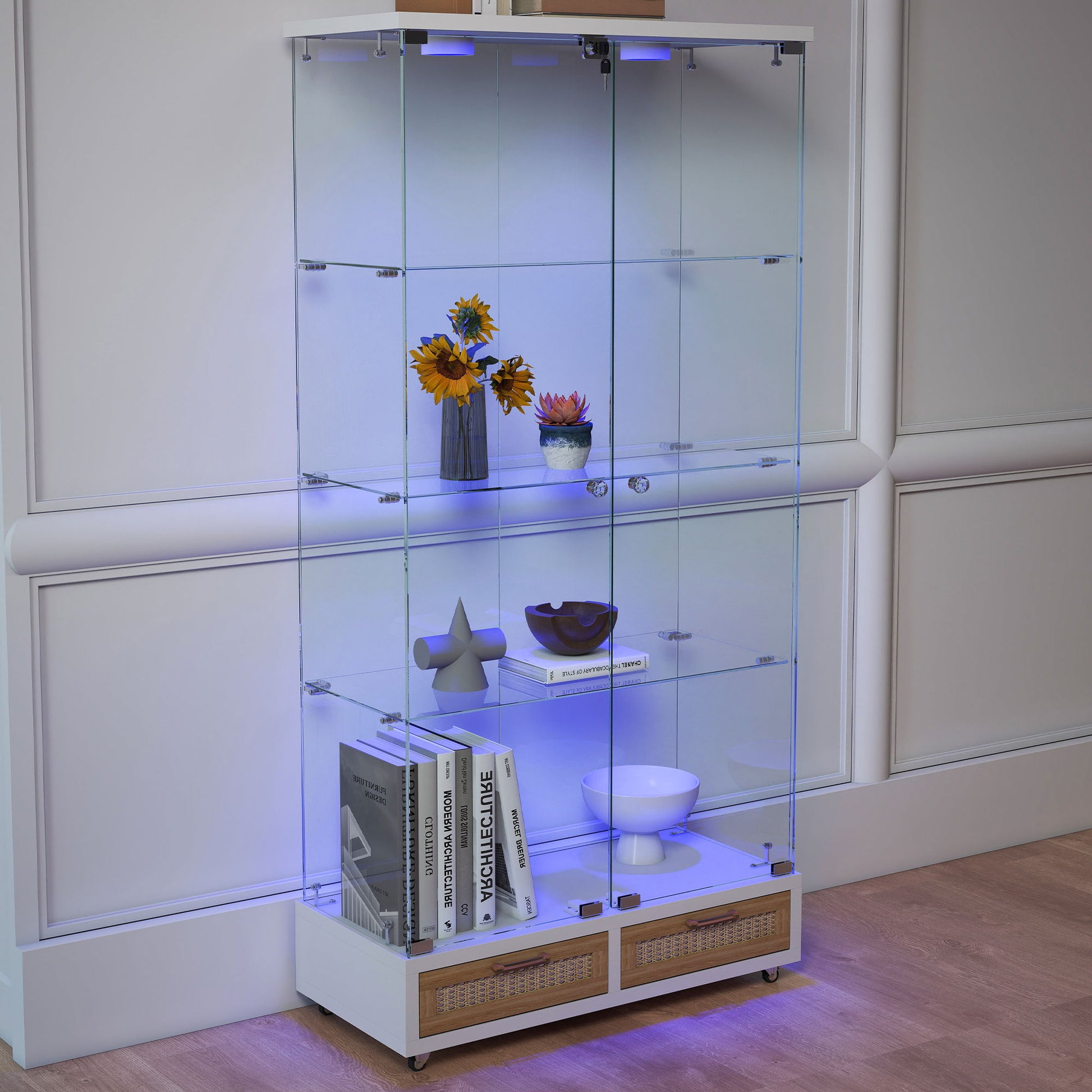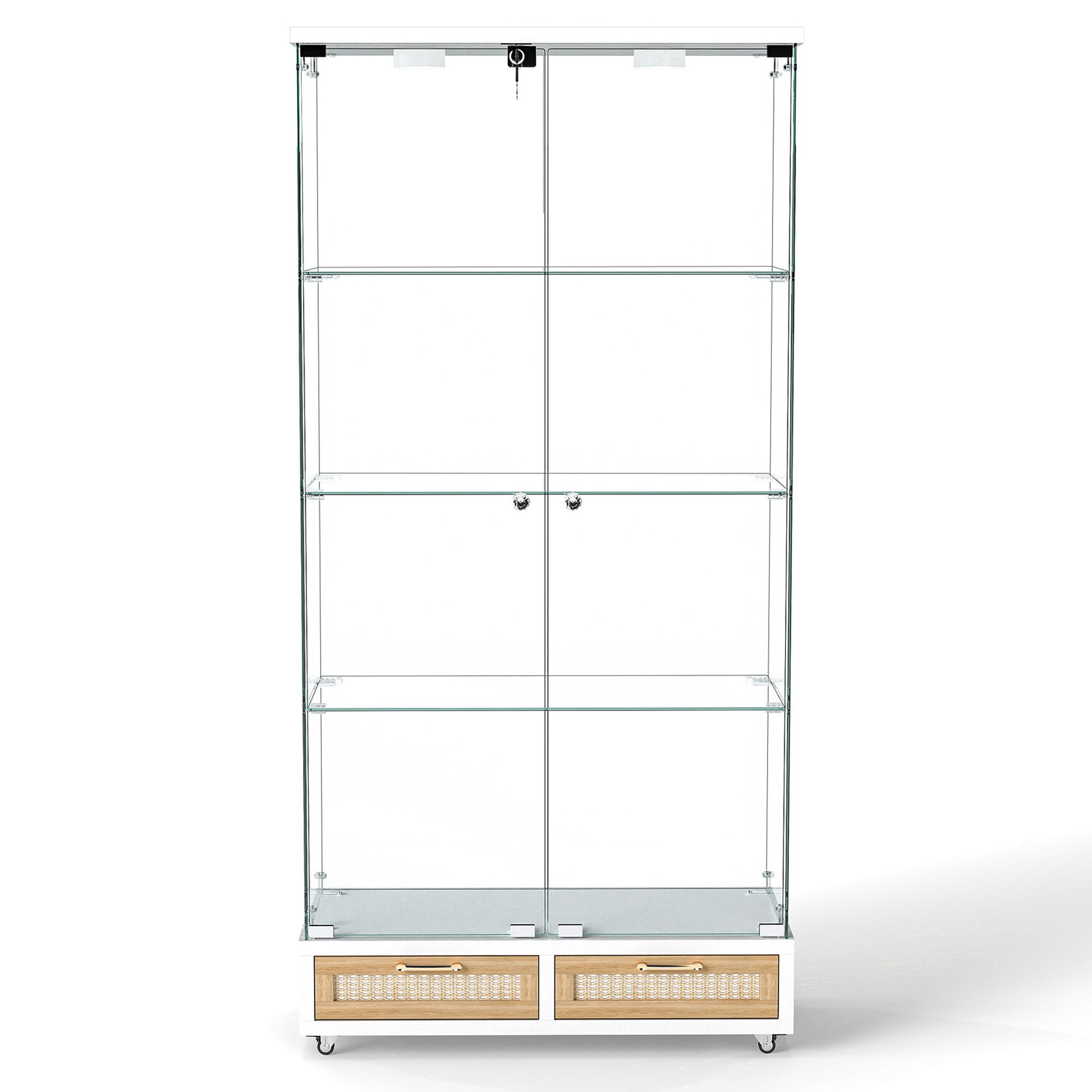 Glass Display Cabinet With LED Lights, Tempered Glass Doors, Large Drawers, 2 Door Storage Case With 4 Shelves - Natural / White