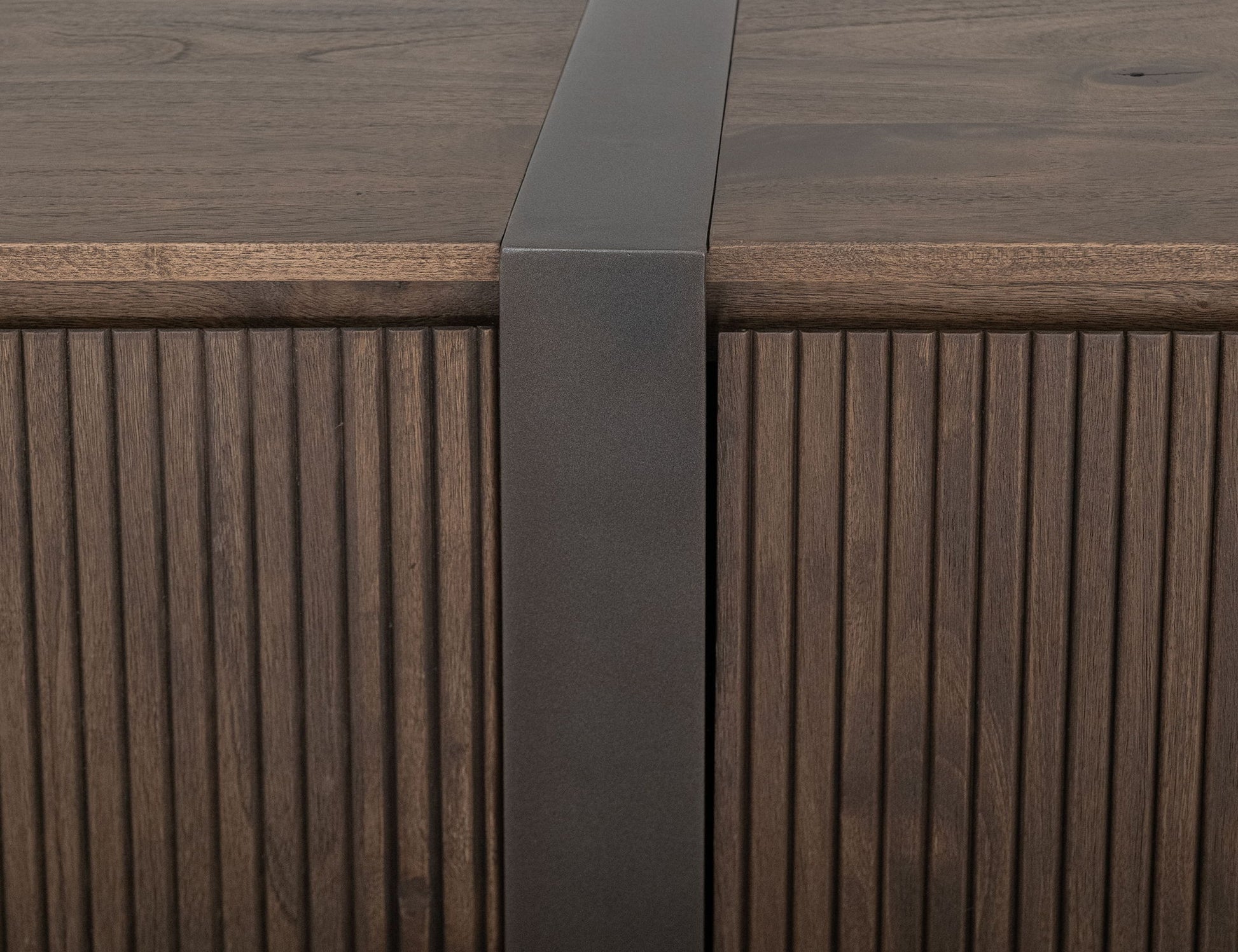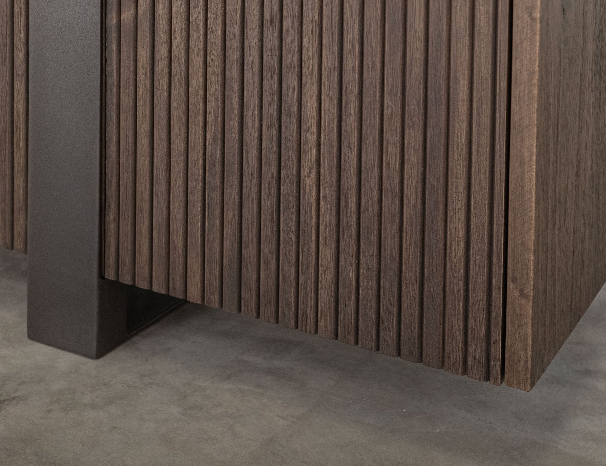 - Lightly distressed wood with a brown multi-step lacquer finish.