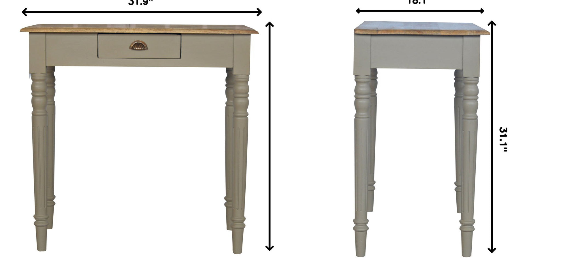 - Hand Painted Writing Desk - This one drawer writing desk is constructed from 100% solid mango wood and has a french grey hand-painted base and a stained oak-ish top. Other features include hand-carved flute legs to add to the vintage French style and a shell handles for easy access into the drawer. The perfect addition to any home.