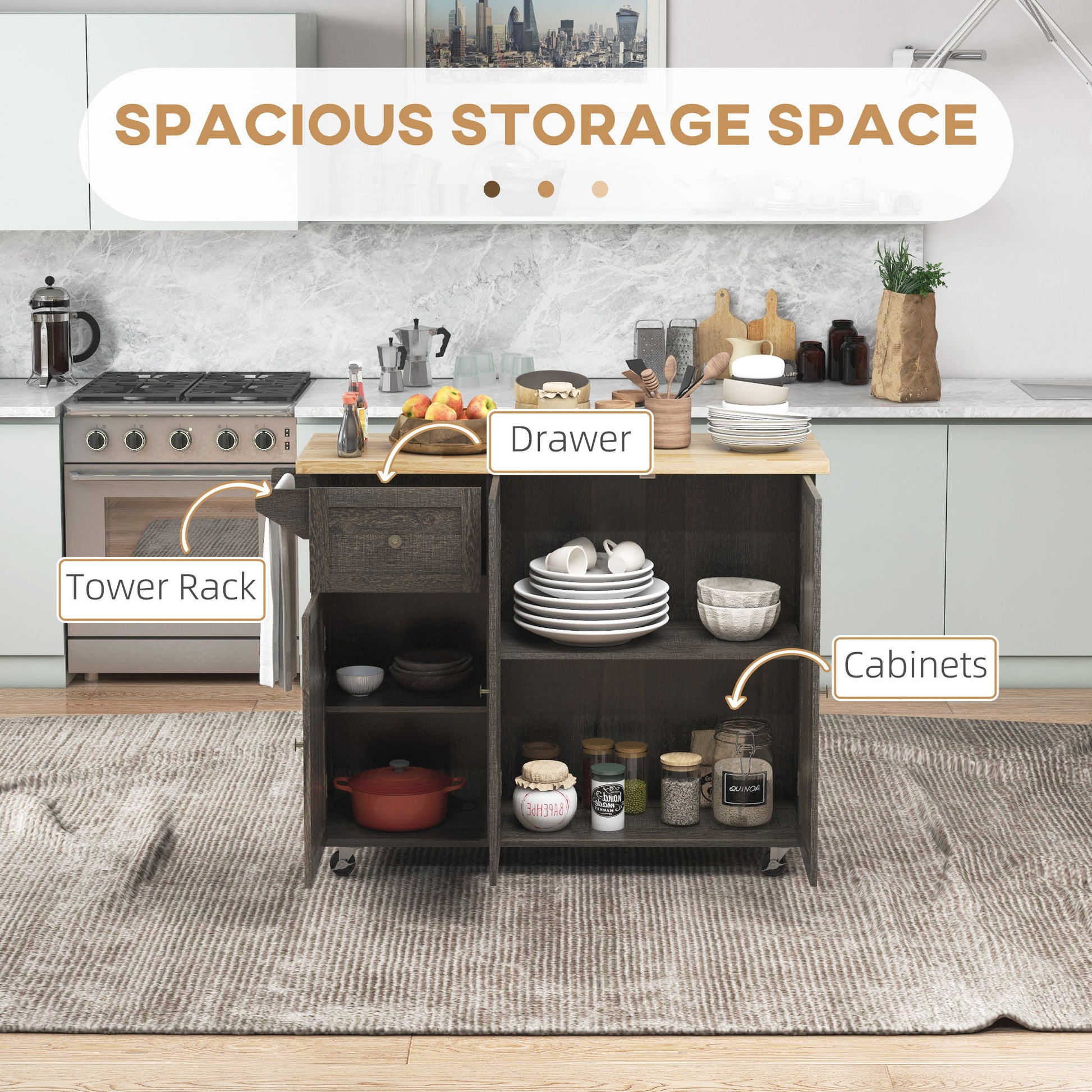 - Additional Chopping Board: Rolling kitchen island with rubberwood butcher block cutting surface for extra food preparation space.
