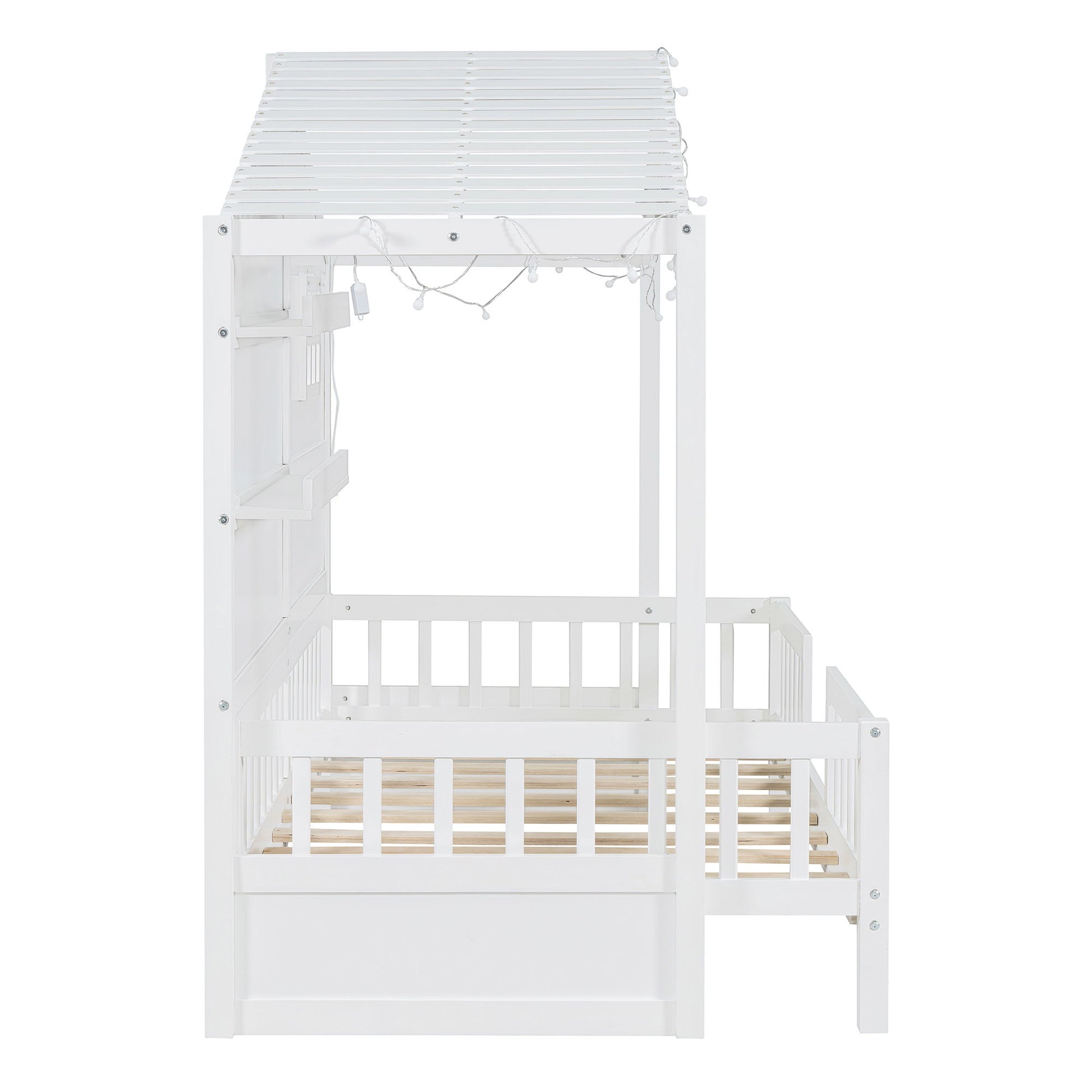Twin Size House Bed With Shelves, Window And Sparkling Light Strip On The Roof - White