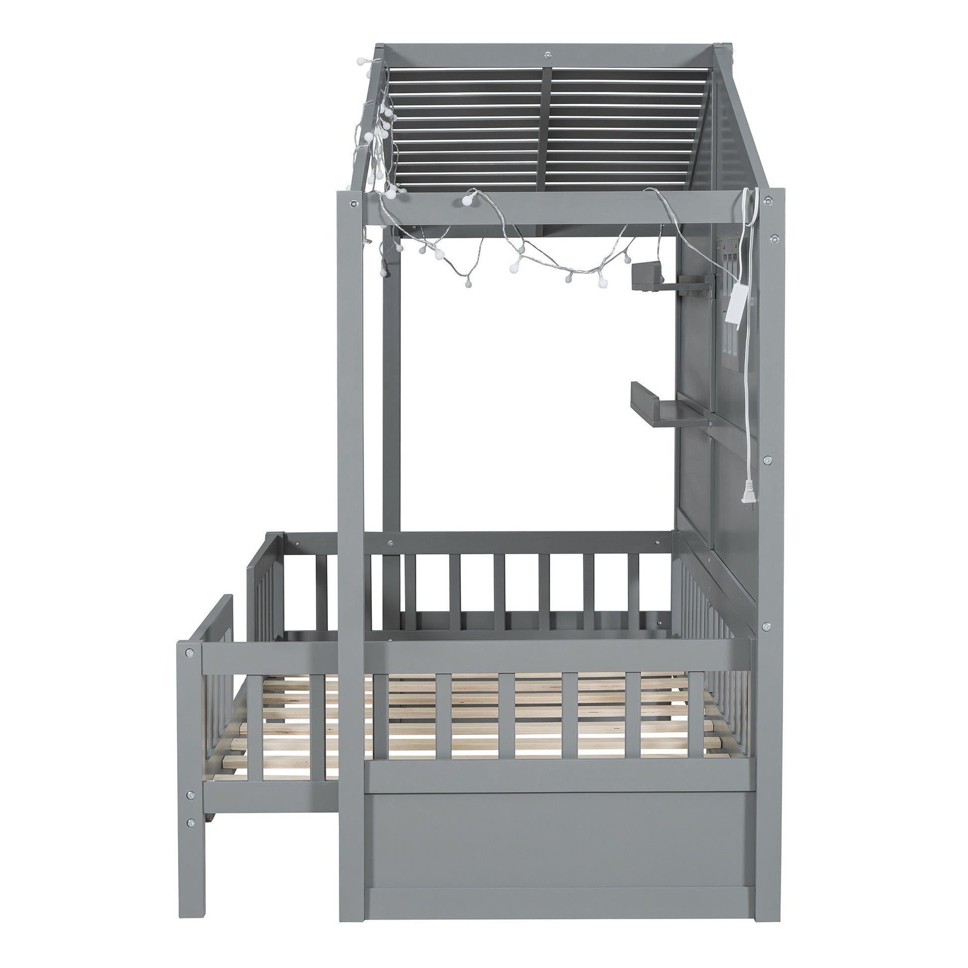 Twin Size House Bed With Shelves, Window And Sparkling Light Strip On The Roof - Gray