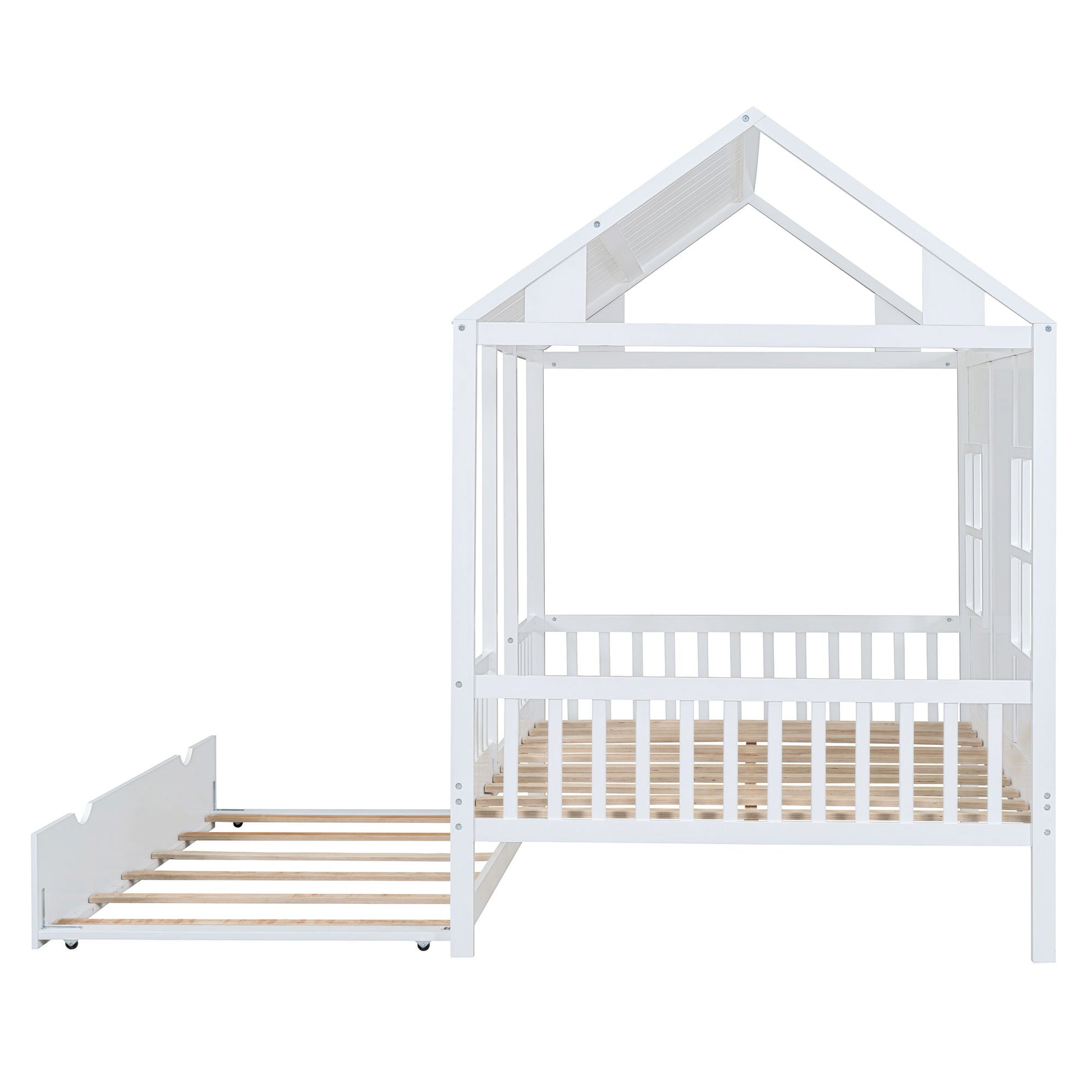 Twin Size House Bed With Twin Size Trundle, Daybed - White