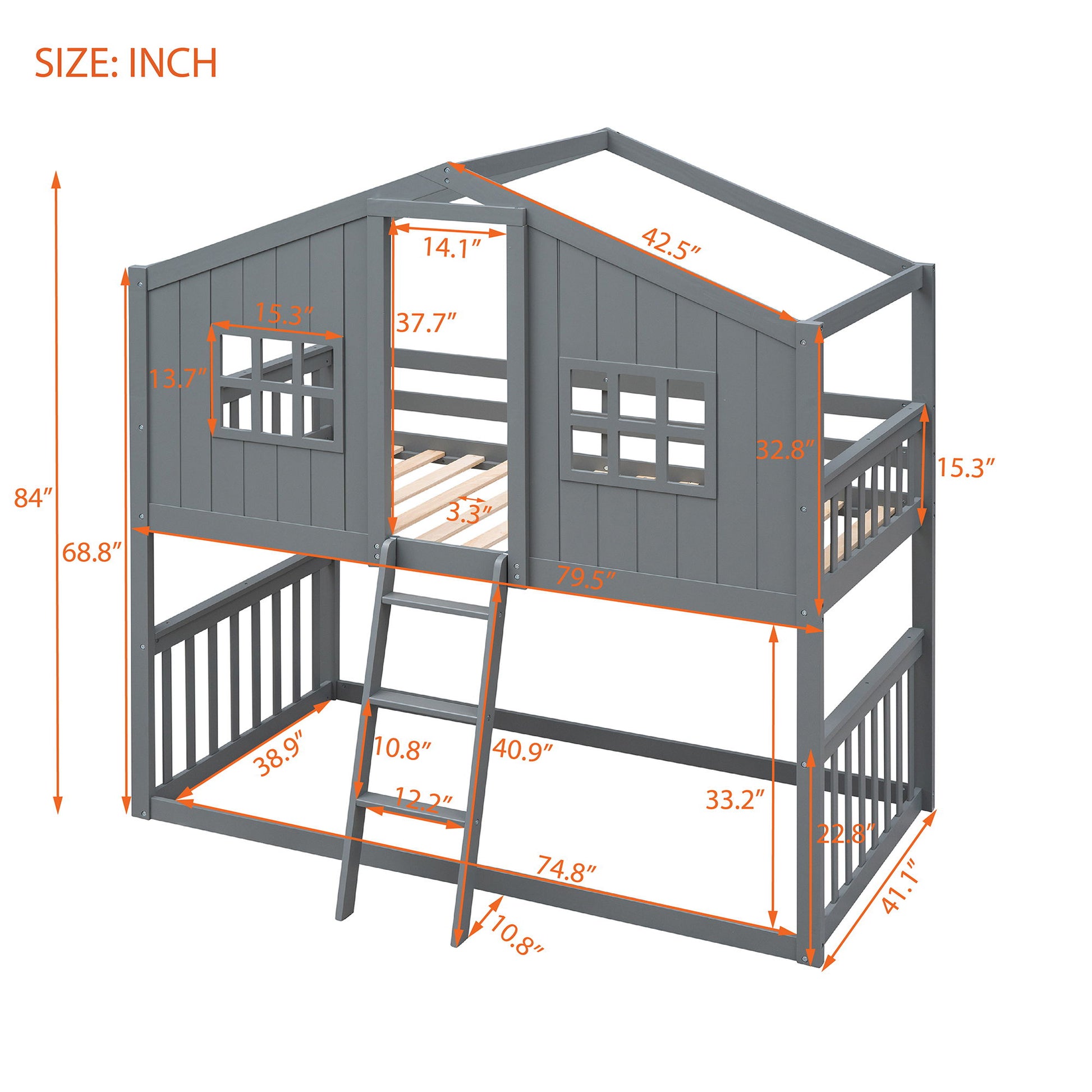 Twin Over Twin House Bunk Bed With Ladder - Gray