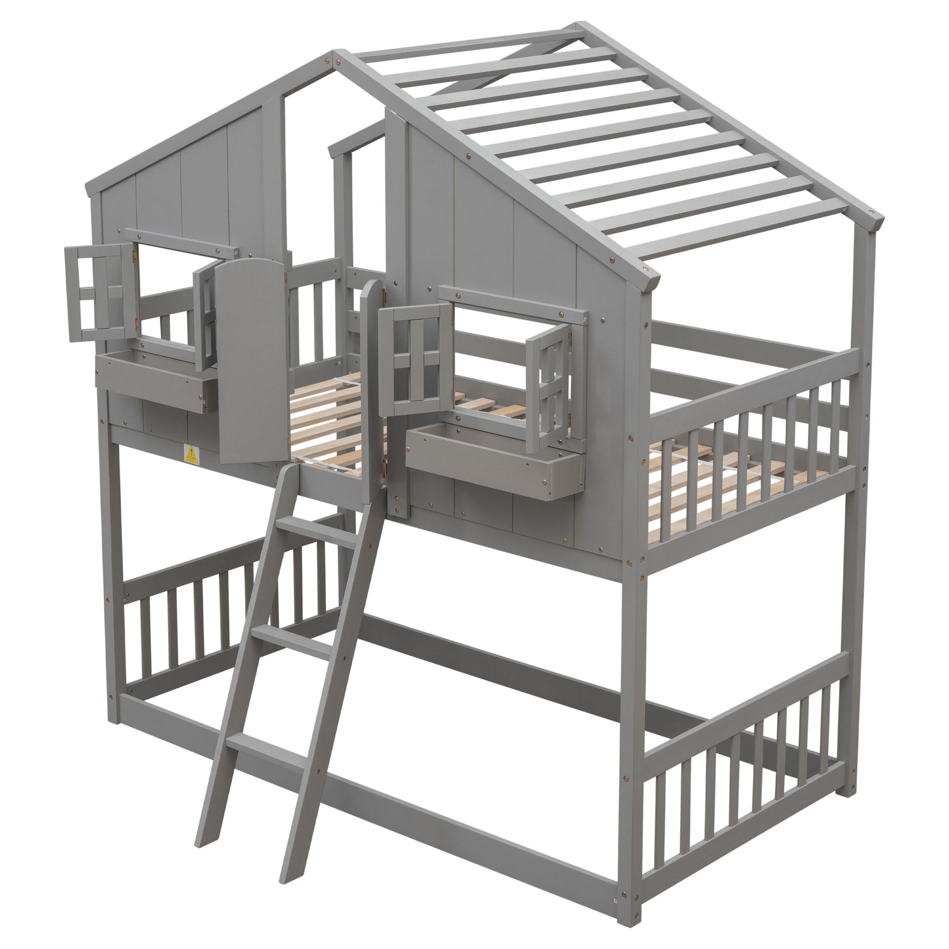 Twin Over Twin House Bunk Bed With Roof, Window, Window Box, Door, With Safety Guardrails And Ladder - Gray