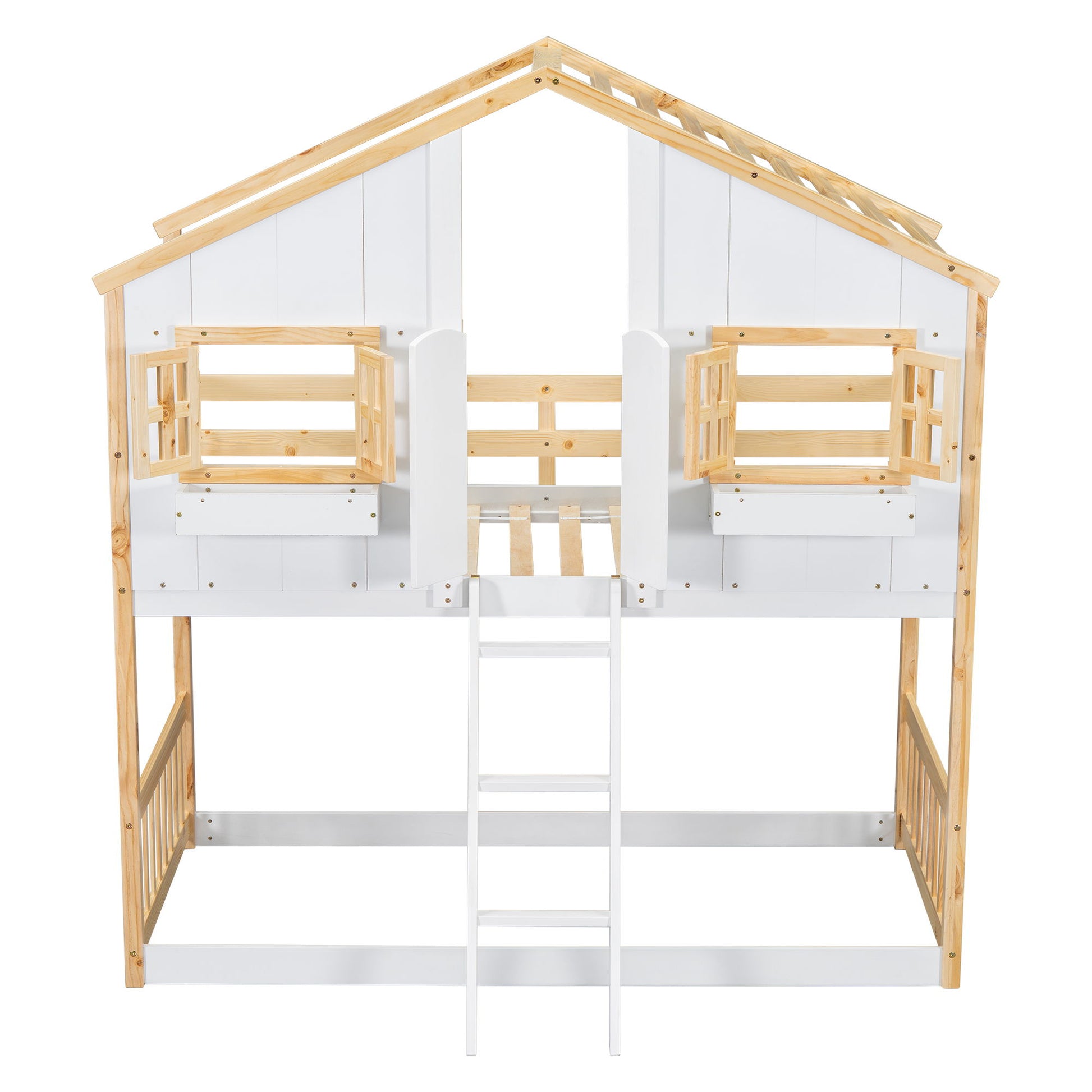 Twin Over Twin House Bunk Bed With Roof, Window, Window Box, Door, With Safety Guardrails And Ladder - Natural / White