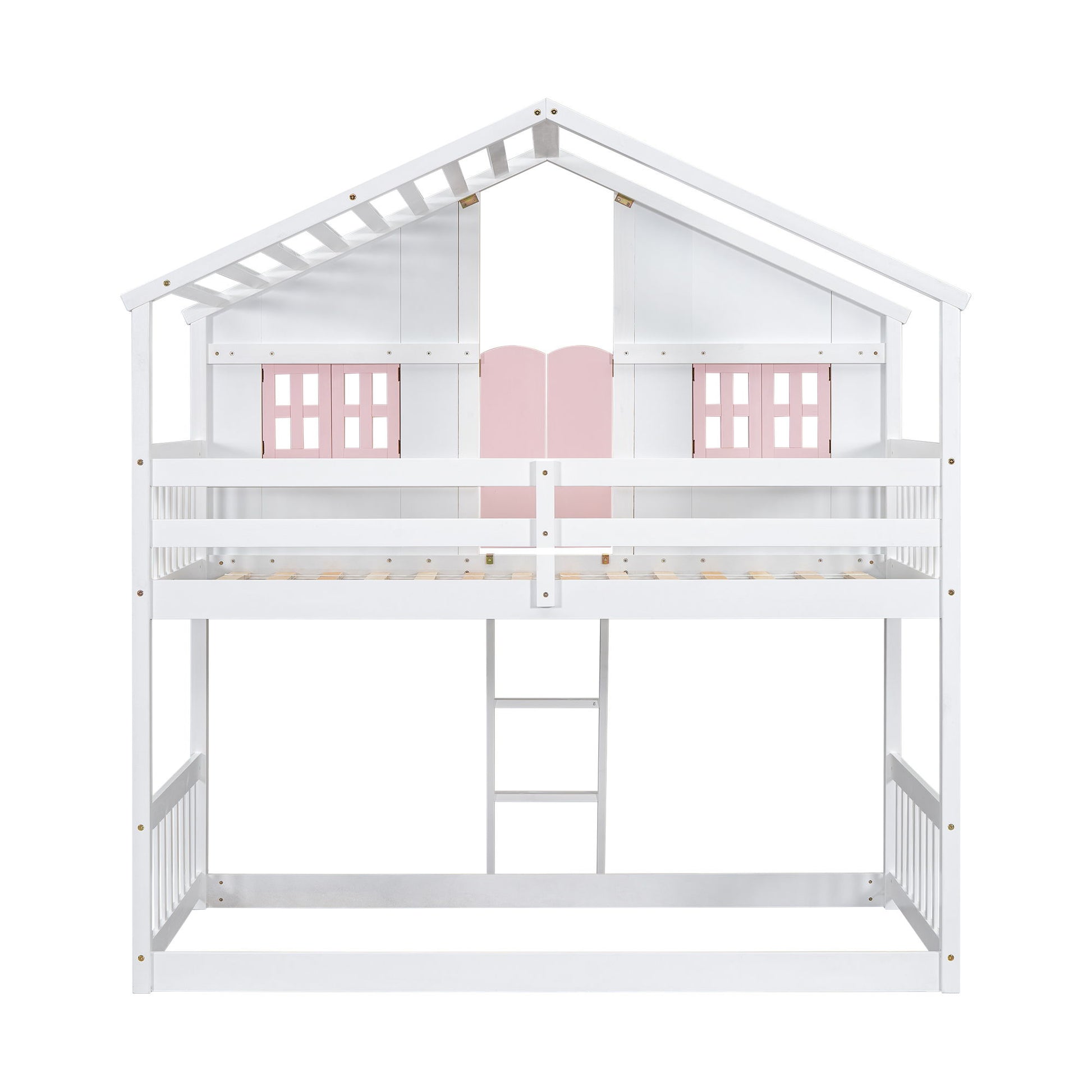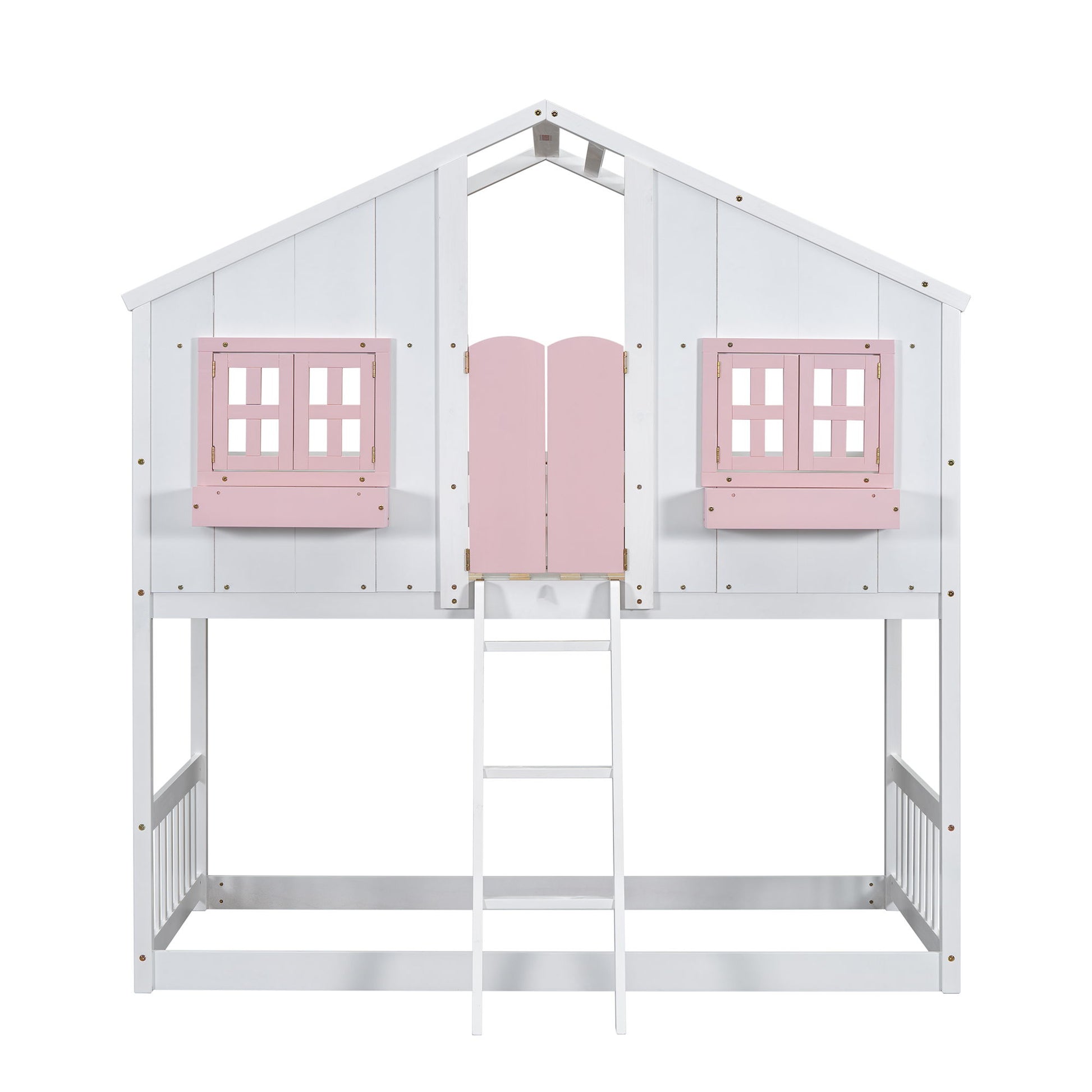 Twin Over Twin House Bunk Bed With Roof, Window, Window Box, Door, With Safety Guardrails And Ladder - Pink / White