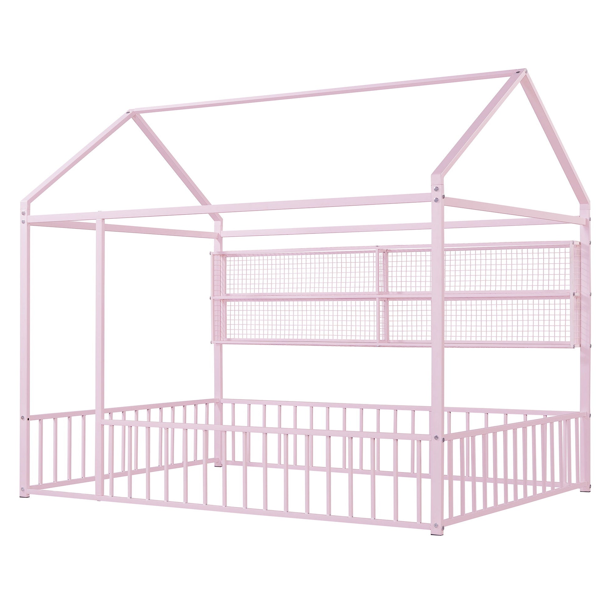 Full Size Bed House Frame With Fence And Shelves - Pink