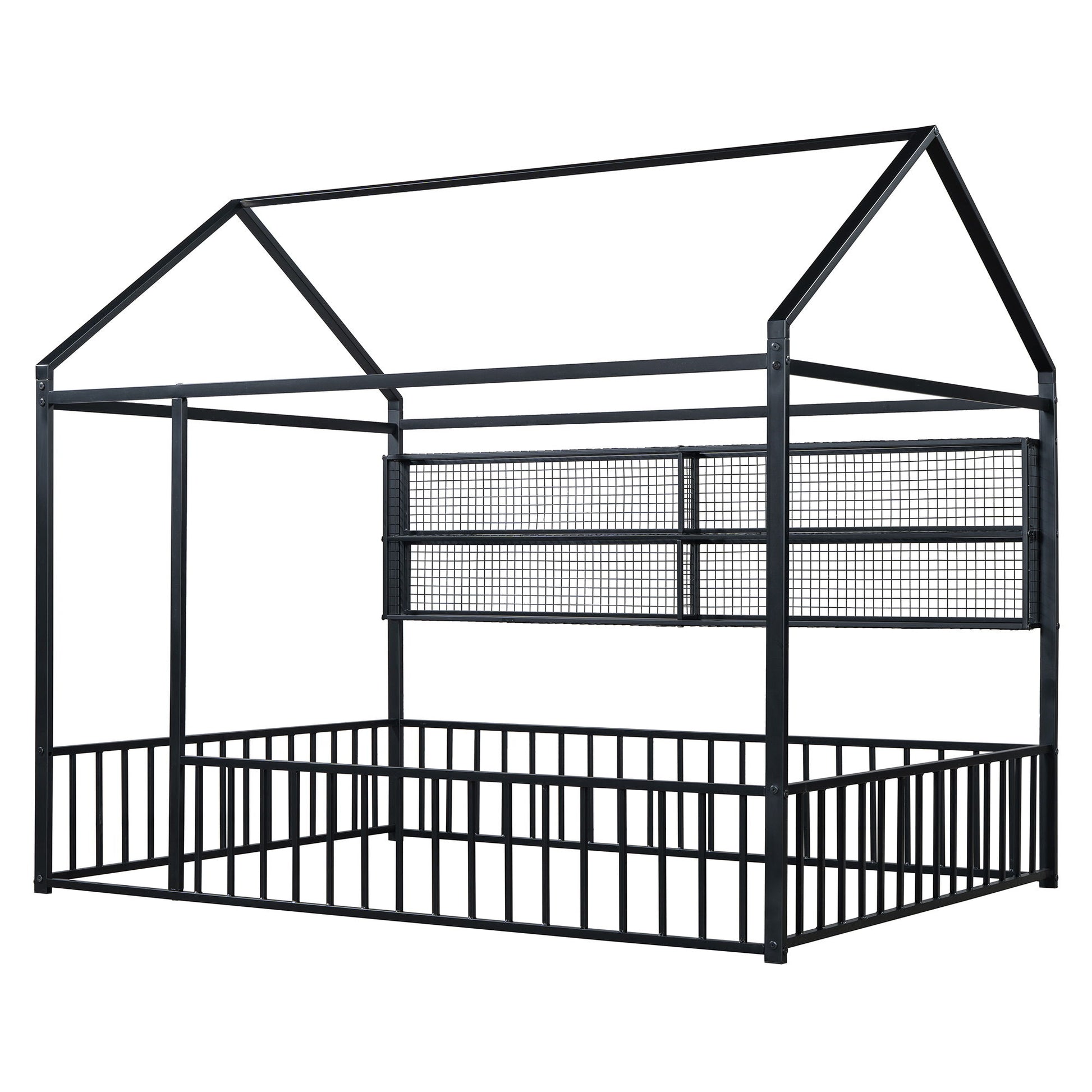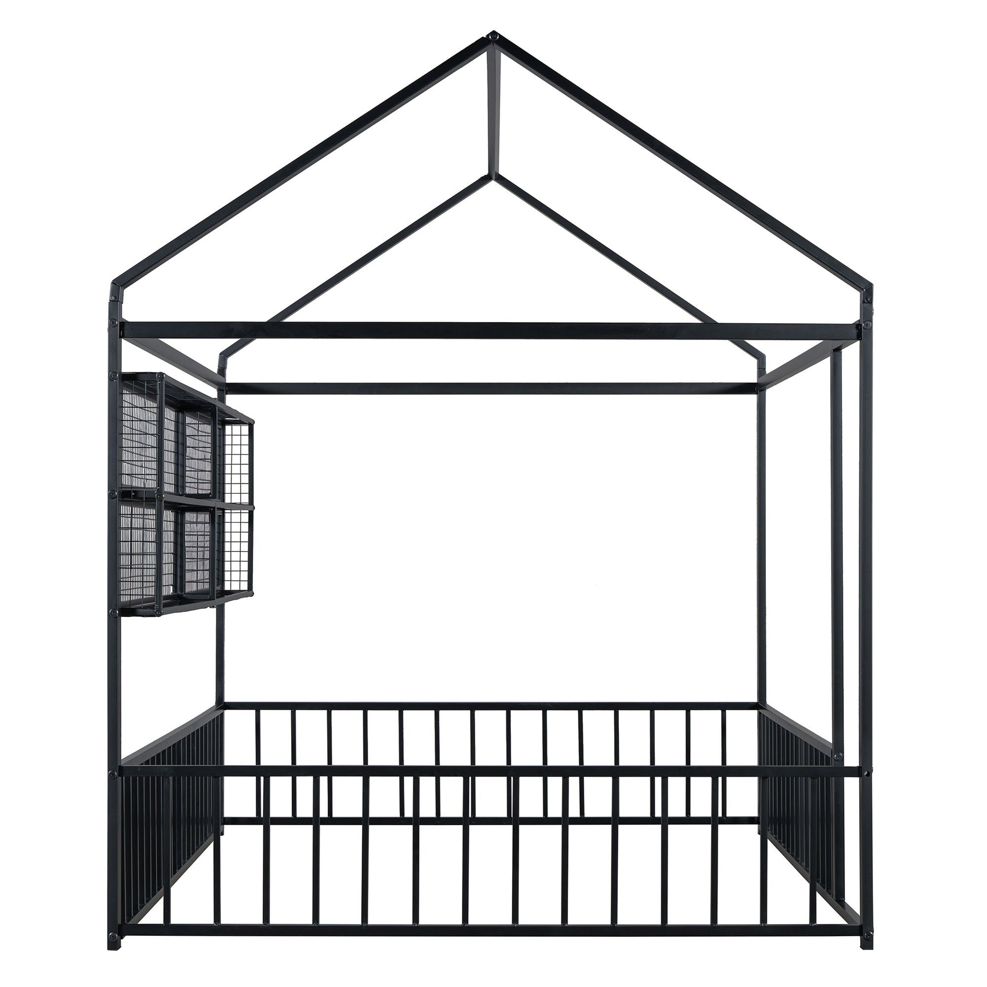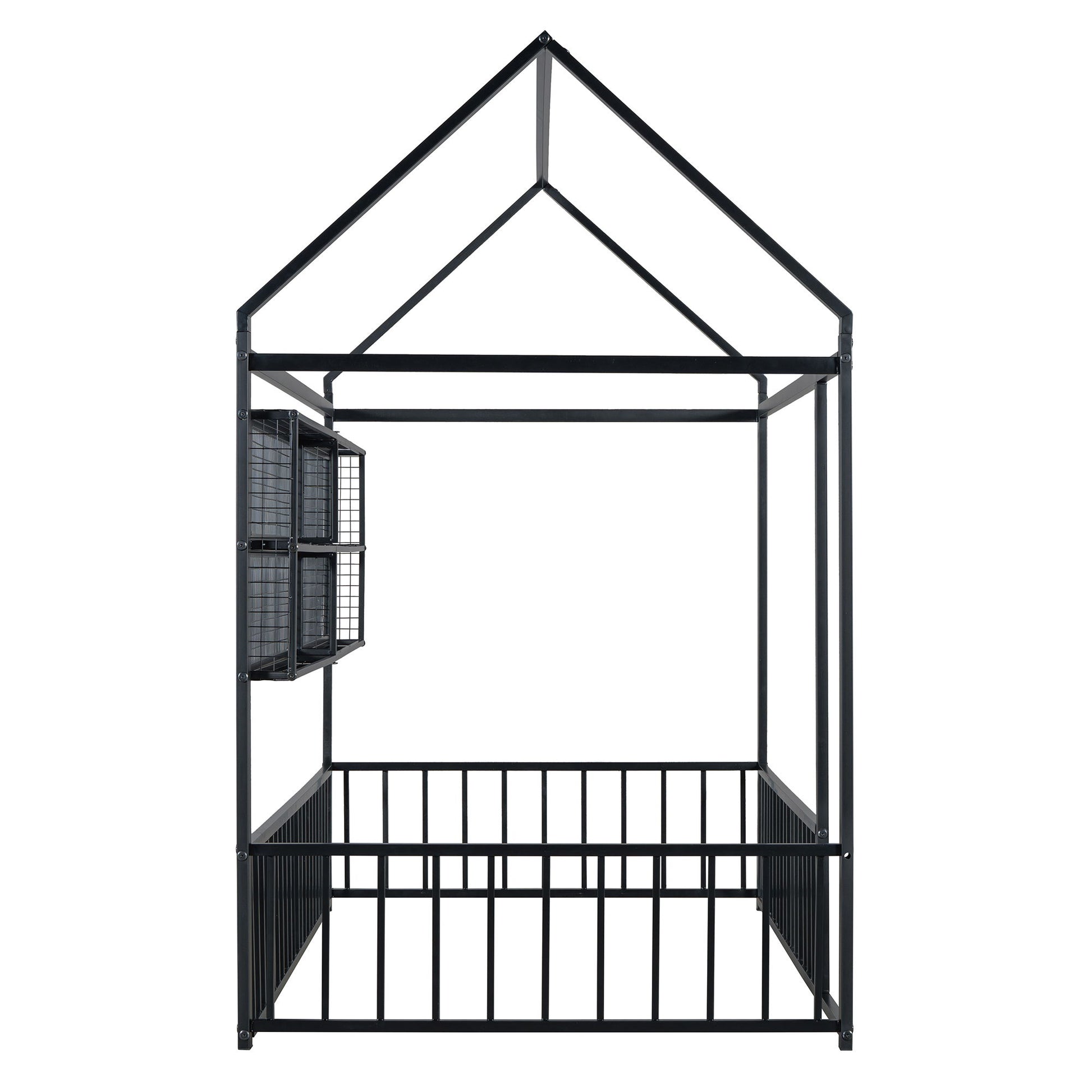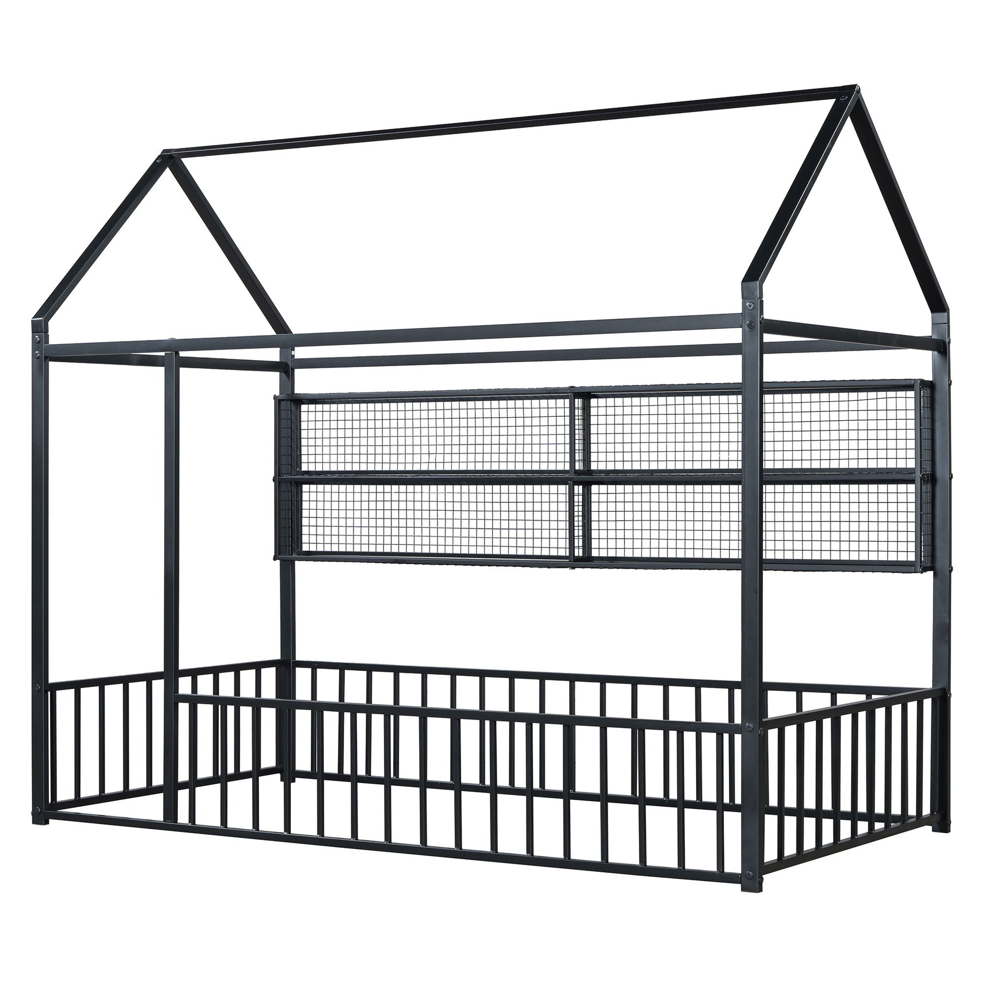 This stylish metal bed frame features a unique house-shaped design, adding a playful yet modern touch to any bedroom. With sturdy metal construction, it ensures long-lasting durability and a secure night's sleep. The back of the bed is equipped with four convenient metal grid shelves, providing extra storage for your essentials while maximizing space. This bed frame blends functionality with a whimsical design, making it a standout piece in any room.