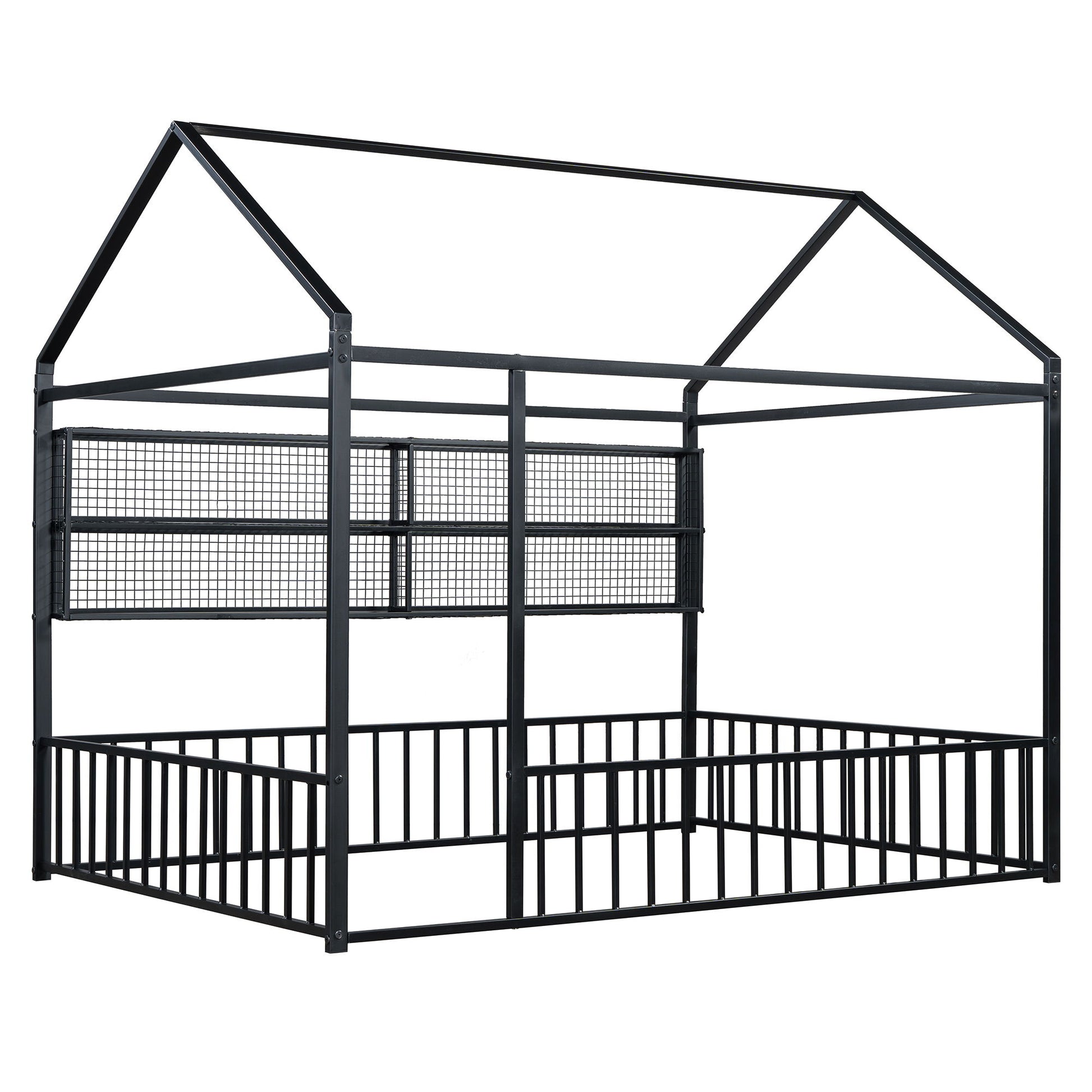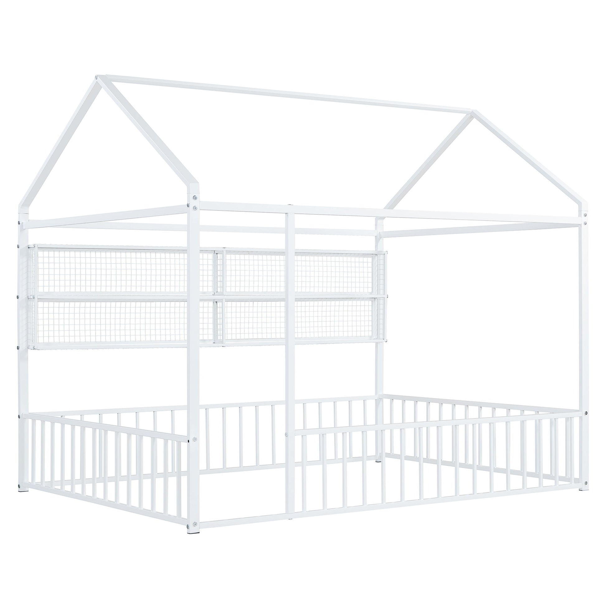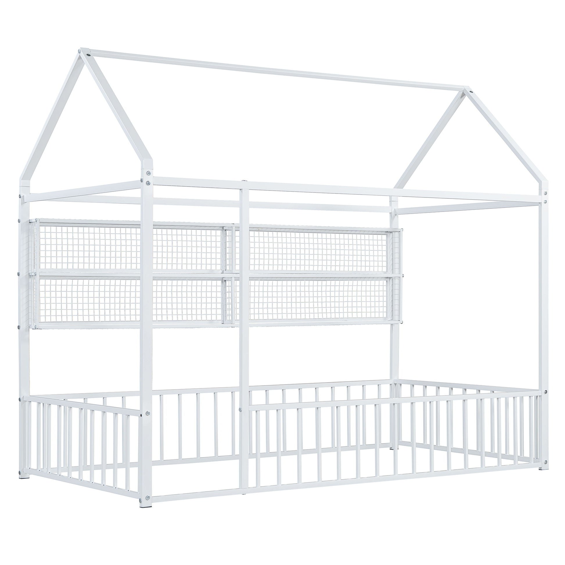 This stylish metal bed frame features a unique house-shaped design, adding a playful yet modern touch to any bedroom. With sturdy metal construction, it ensures long-lasting durability and a secure night's sleep. The back of the bed is equipped with four convenient metal grid shelves, providing extra storage for your essentials while maximizing space. This bed frame blends functionality with a whimsical design, making it a standout piece in any room.