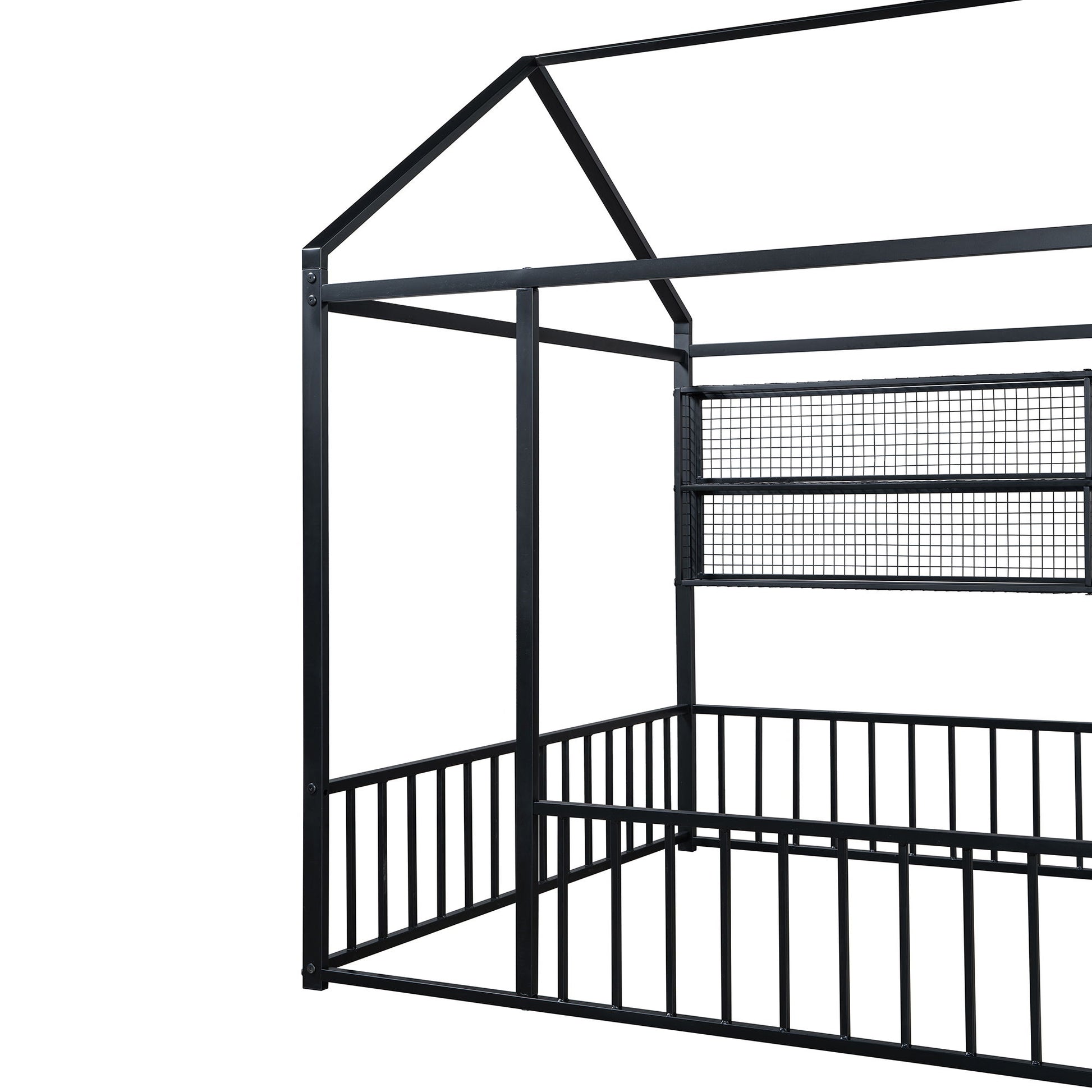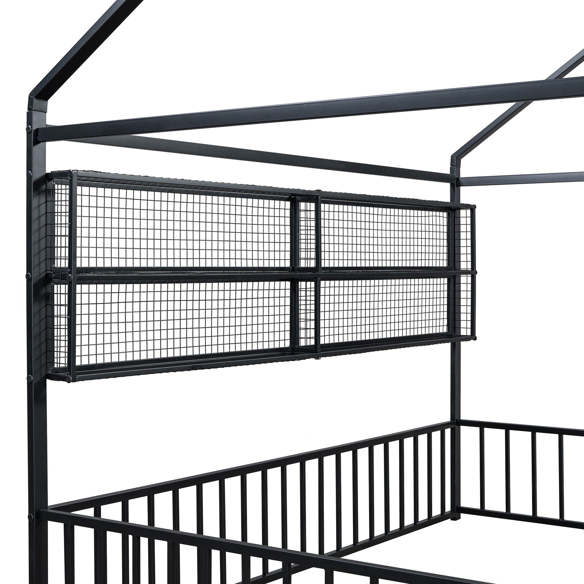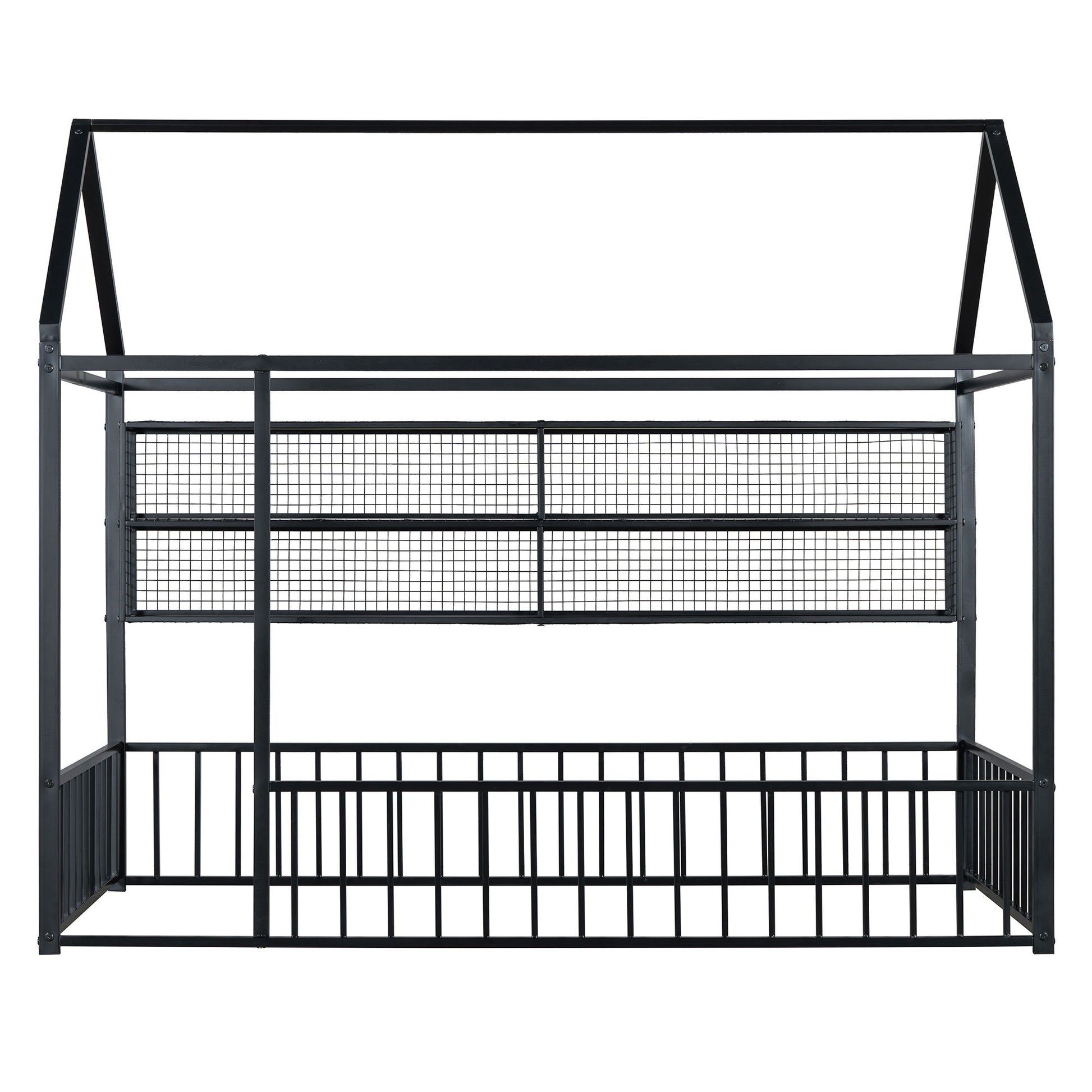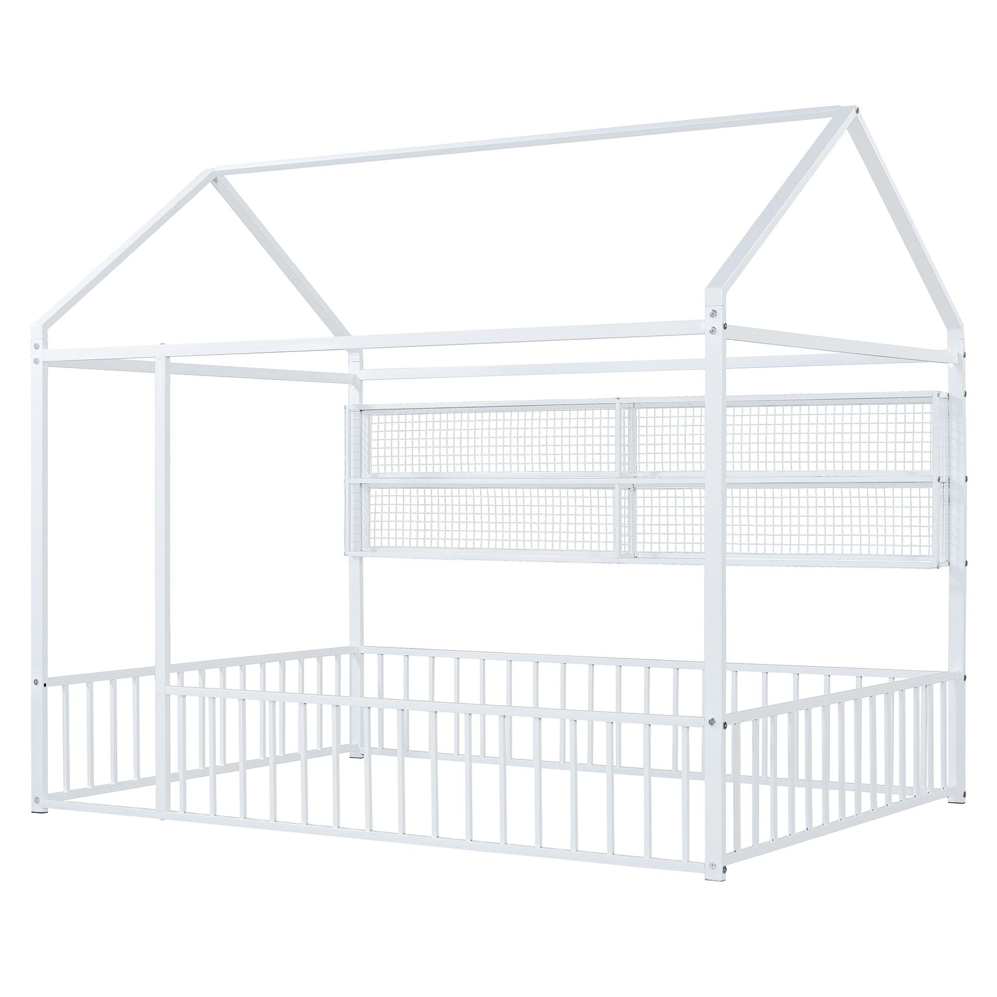 This stylish metal bed frame features a unique house-shaped design, adding a playful yet modern touch to any bedroom. With sturdy metal construction, it ensures long-lasting durability and a secure night's sleep. The back of the bed is equipped with four convenient metal grid shelves, providing extra storage for your essentials while maximizing space. This bed frame blends functionality with a whimsical design, making it a standout piece in any room.