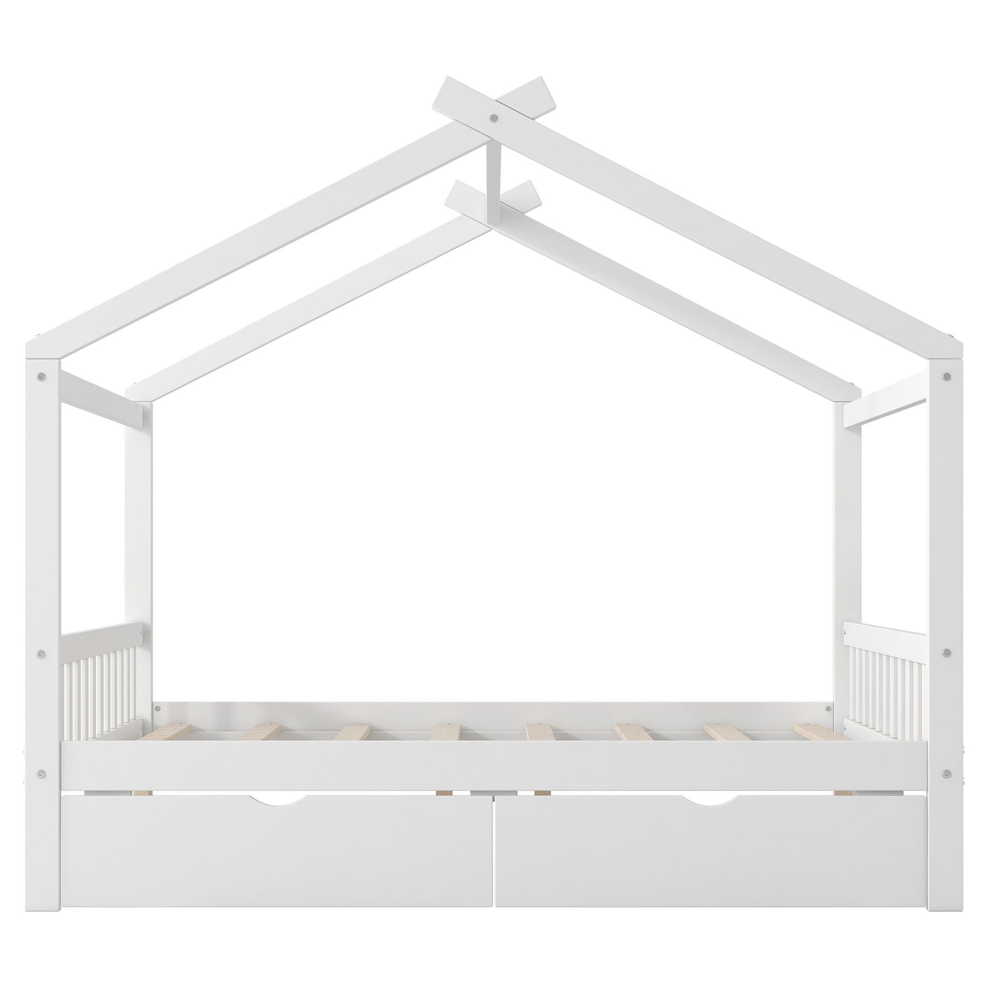House Style Platform Bed With Headboard, Footboard, 2 Drawers, And Roof Design