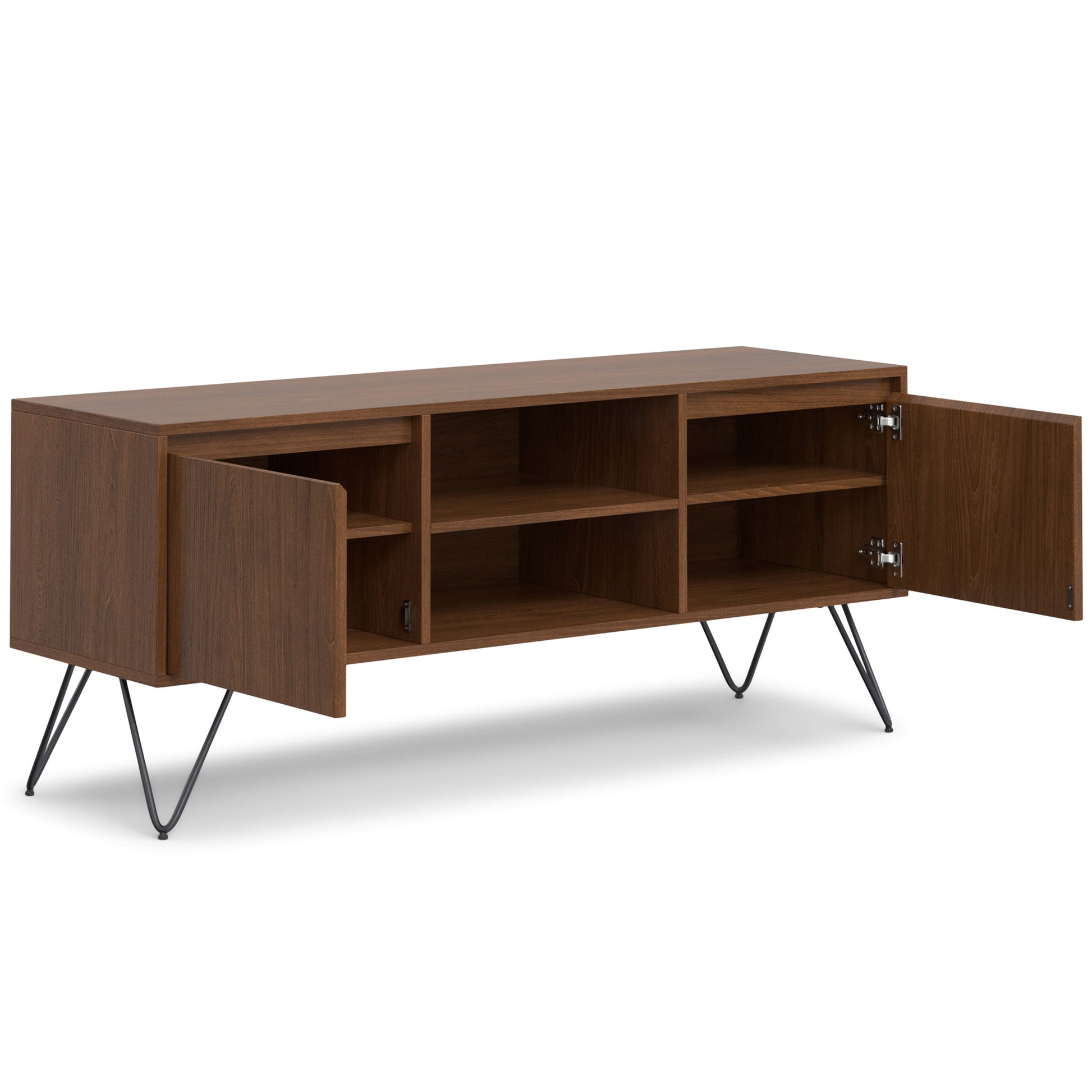 - Features two (2) side cabinets with two (2) adjustable shelves and soft closing hinges with open central space with one (1) shelf and four (4) black iron hairpin legs