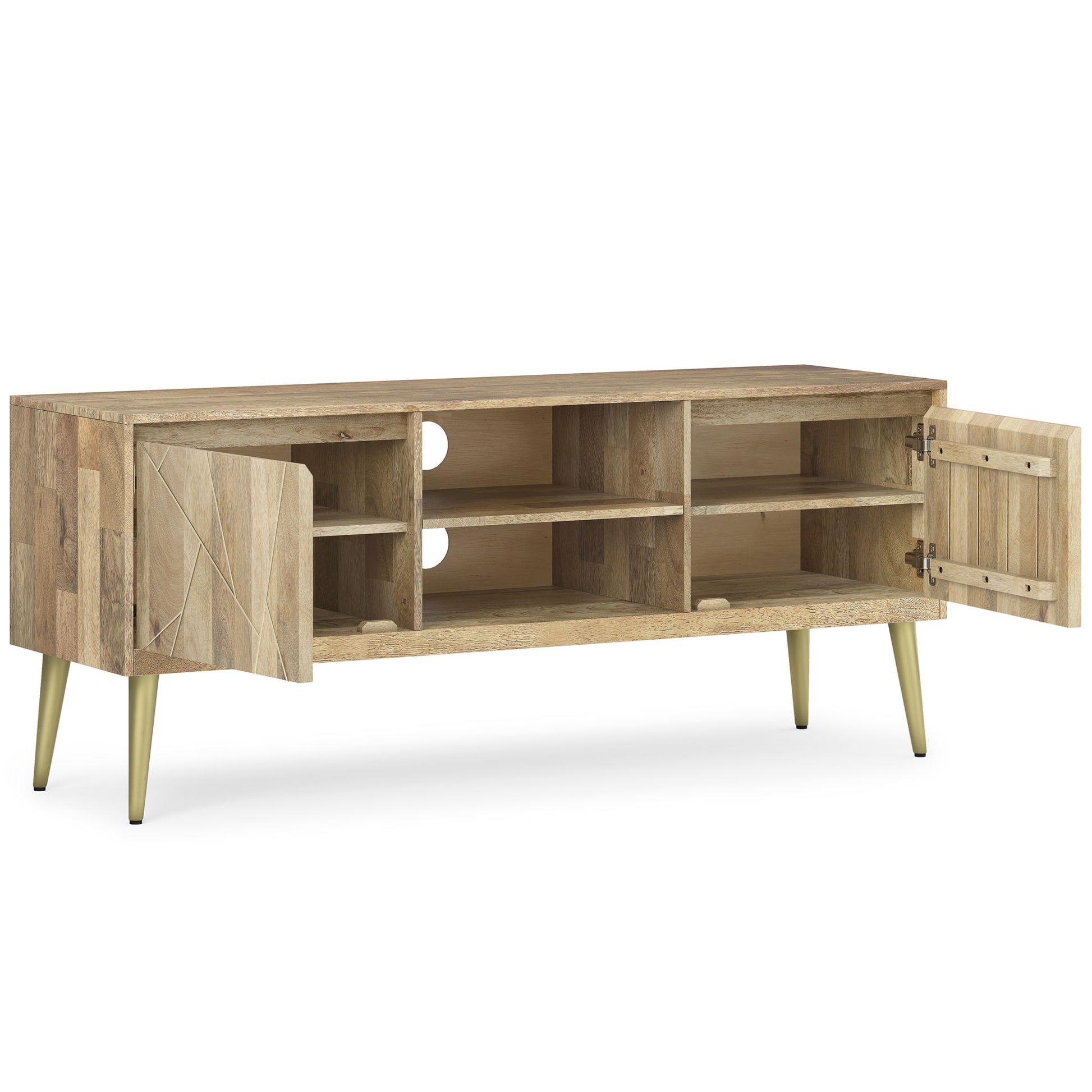 - TV Stand is perfect for TVs up to 65 inches, showcases a unique geometric brass metal inlay and four gold finished metal legs