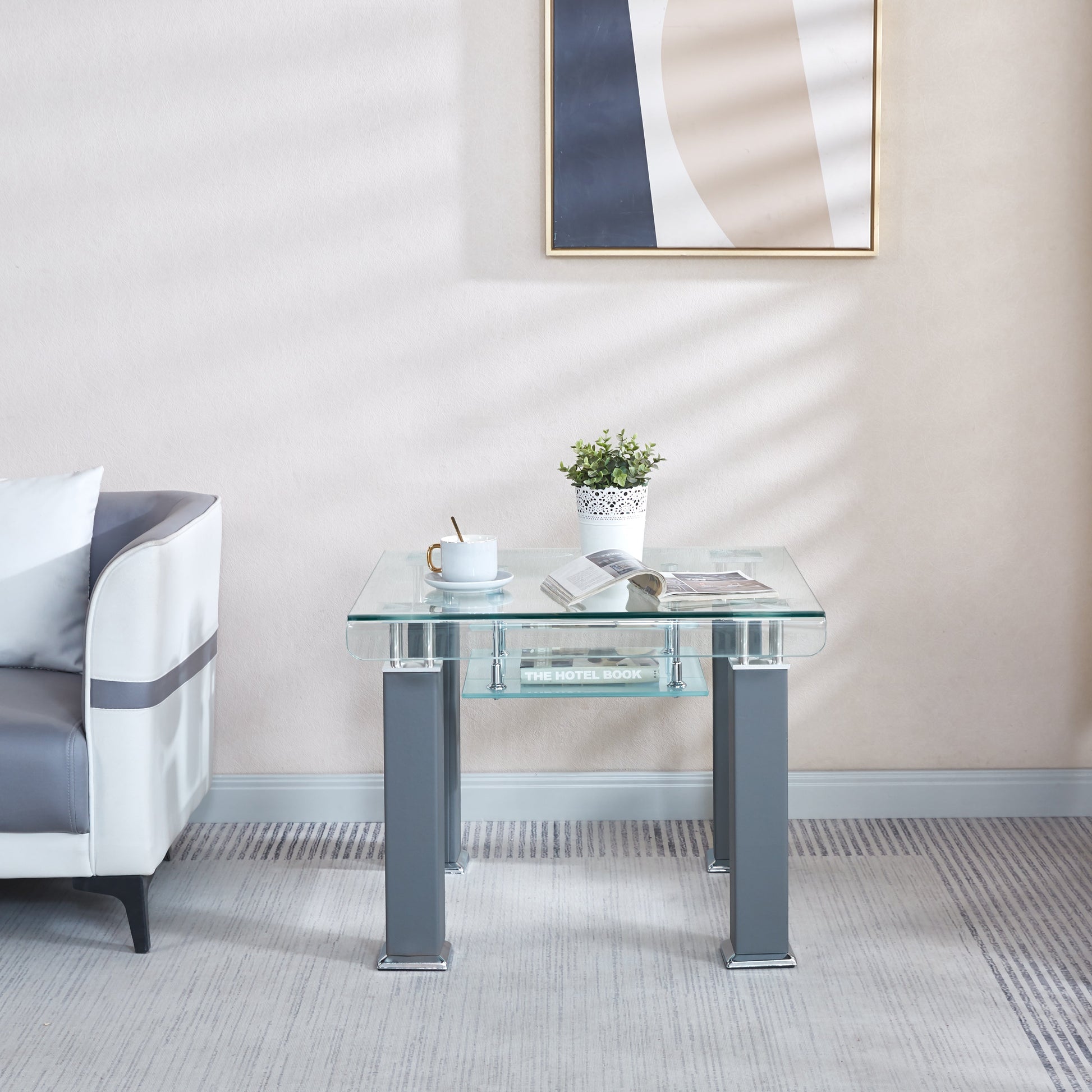 Enhance your living space with this sleek and modern end table, designed for both style and functionality. The table features a durable 10mm tempered glass top paired with an 8mm inner glass shelf, providing ample surface space and storage for décor or essentials. A sturdy metal frame ensures stability, while the leatherette accents in black, grey, or white add a contemporary touch. Its clean lines and minimalist design make it a perfect addition to any living room, office, or bedroom. Assembly is required but easy to accomplish, giving you a stylish piece in no time.
