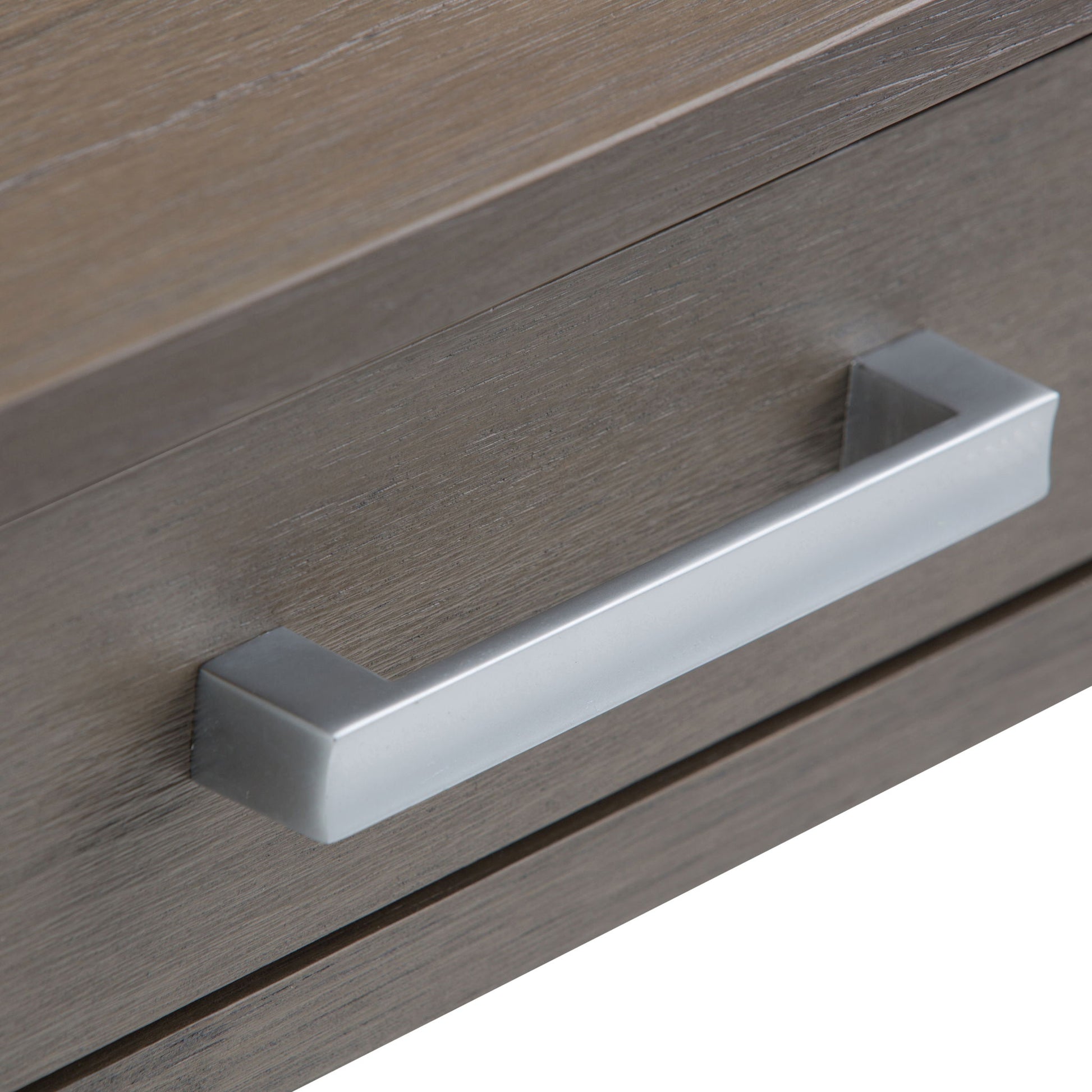 - Contemporary design includes brushed nickel pulls and X design detail, great for limited space