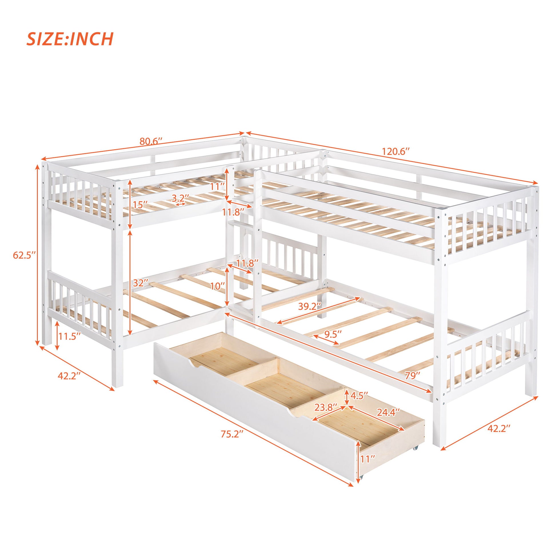 Twin L Shaped Bunk Bed With Drawers - White
