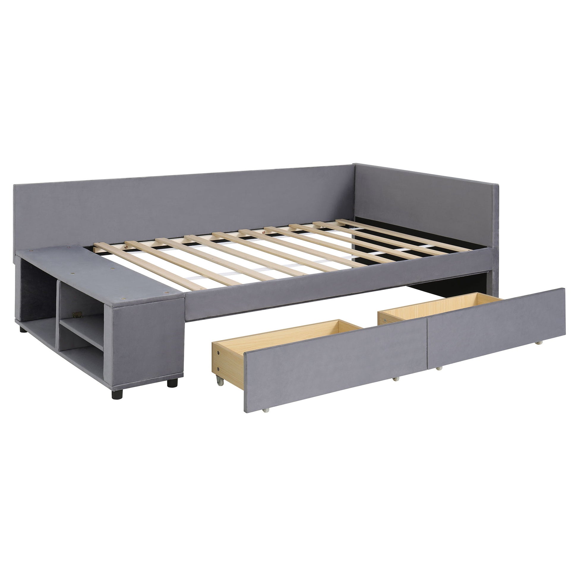 Twin L Shaped Upholstered Platform Bed With Storage Drawers - Gray