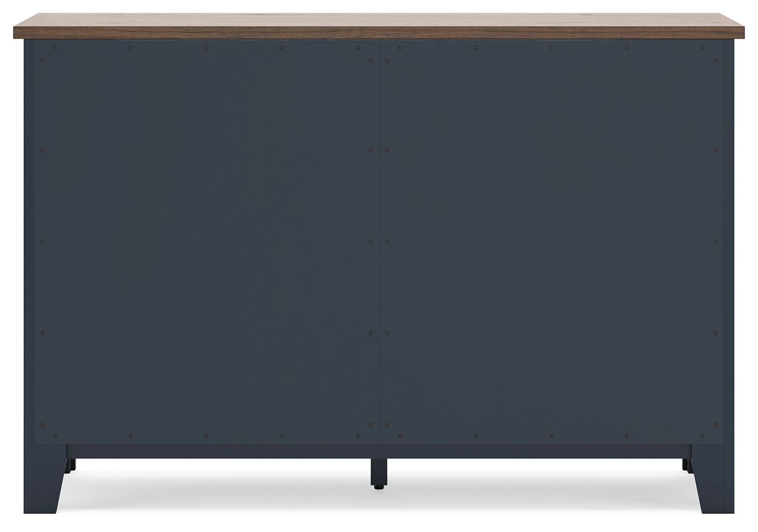 - Two-tone finish features a dark slate blue with a light brown wood-tone top