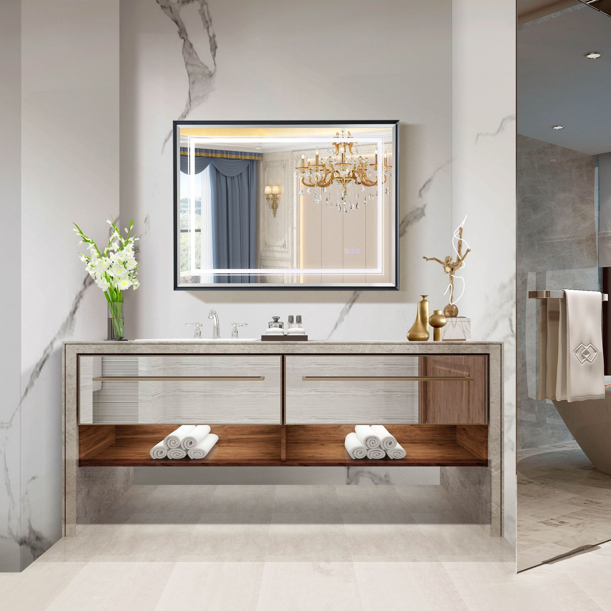 40*30" LED Bathroom Beveled Mirror, 3000 - 6000K Gradient Front And Backlit LED Mirror For Bathroom, 3 Colors Dimmable, Ip54 Enhanced Anti - Fog, Hanging Plates Wall Mount Lighted Mirror - Gray